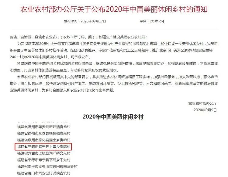 ▲崇际村村庄风貌 近日,农业农村部办公厅公布2020年中国美丽休闲乡村名单,全国246个村获评为2020年中国美丽休闲乡村,泰宁县上青乡崇际村榜上有名。 崇际村位于上青乡南部,距县城18公里,全村区域面积为13.5平方公里,世界自然遗产、世界地质公园核心景区上清溪、九龙潭、红石沟等景区均位于境内,是泰宁县“五朵金花”旅游专业村之一。