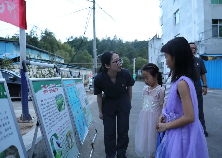 活动现场,大家拉上横幅,搭好桌椅,一叠叠反诈骗、野生动物保护、普法案例、便民服务卡等图文并茂的宣传资料依次排开,并设置展板展示国家一级、二级保护动物和典型案例,吸引来往村民驻足观看,营造浓浓的法治氛围。