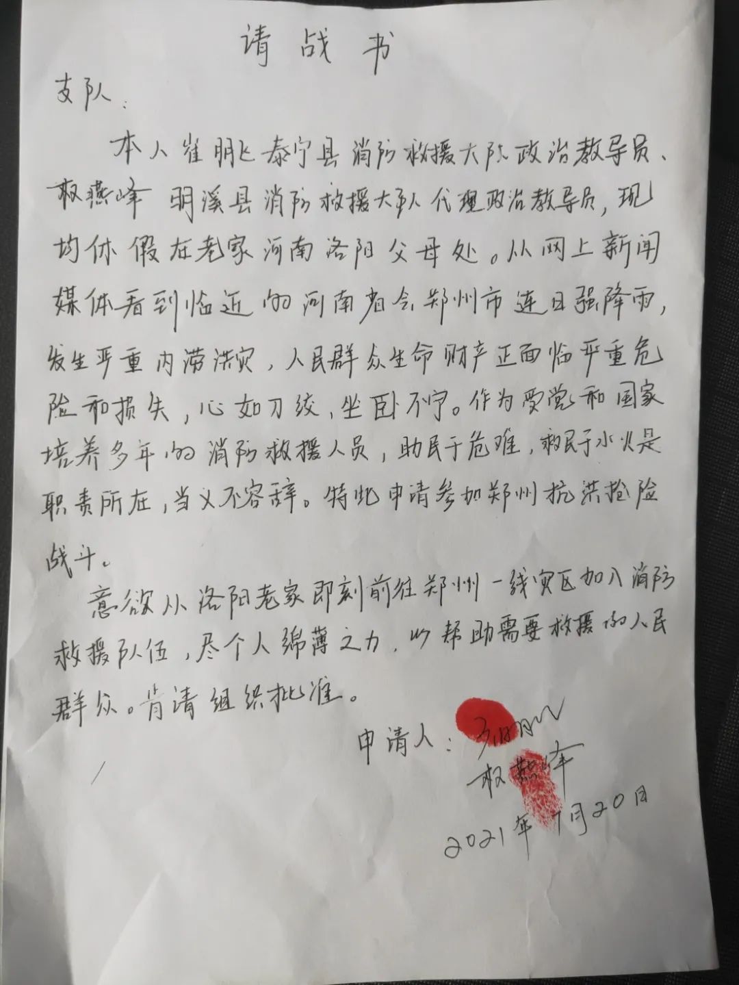 ▲图为崔朋飞的请战书