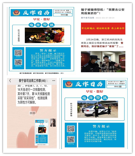 为切实提高人民群众对打击电信网络诈骗的知晓度,最大限度保护人民群众的财产安全和合法权益。连日来,泰宁县司法局开展“全民行动 无诈泰宁”防范电信诈骗法治宣传系列活动,突出防范宣传,力争多角度、全方位开展防范宣传工作。 线上线下结合宣传。线上,充分利用“泰宁县司法局”微信公众号,将常见的诈骗类型,如仿冒、兼职、免费送等作案手法及套路进行梳理,进行警示。同时借助微信工作群,不定期在群内推送防电信诈骗宣传内容,不断提高广大群众的法律意识。线下,深入社区、校园、乡村、集镇等,通过在广场、公告栏、集市、公园等人流密集的地方设置咨询台、悬挂宣传条幅、发放宣传资料、张贴海报等方式,在辖区内营造起良好的宣传氛围。