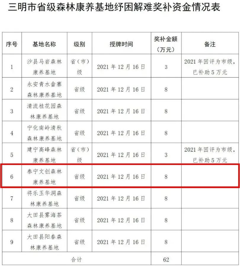 近日,三明市林业局发布关于下拨省级森林康养基地纾困解难奖补资金的通知,决定对2021年被确定为省级森林康养基地的永安青水畲寨、清流桂花园、宁化南岭清秋、将乐玉华洞、泰宁文创、大田雾海茶、大田阳春等7个森林康养基地,每个基地给予奖补资金8万元;对2021年从市级升格为省级的沙县马岩、建宁高峰等2个森林康养基地,每个基地给予奖补资金3万元。