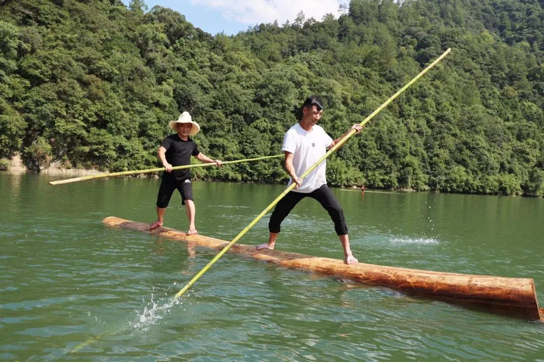 一人一木,在河面上左右点水、快速前行。作为开善乡池潭村村民们的“独门绝技”,独木漂技艺人蔡隆禧正在教授独木漂的技艺要点。