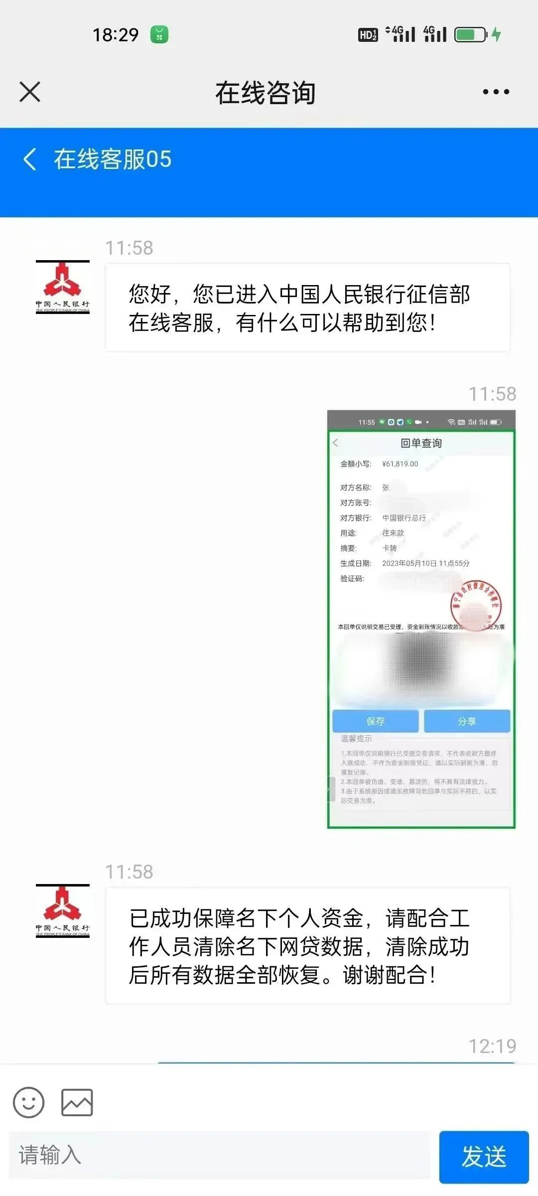 “对方给了我一个银行账户,说是中国人民银行所属账户,要求我向这个账户转账,再将转账截图发给‘中国人民银行征信部在线客服’,这样他们就能操作降低贷款利率。京东白条成功关闭后,所有的转账都会原路退回。”
