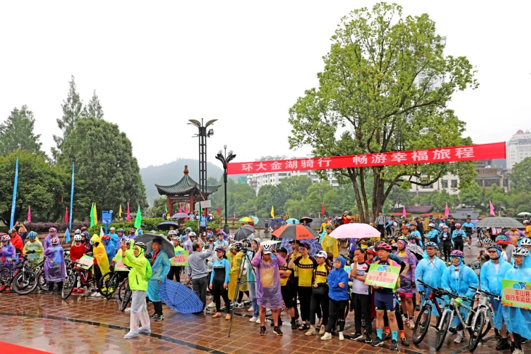 开幕式上,洪亮的汽笛声拉开了比赛的序幕。赛场上,随着发令枪响,比赛正式开始。一辆辆自行车从起点处鱼贯而出,在阵阵雨水中汇聚成一道五彩斑斓的彩虹车潮。骑友们穿梭在烟雨浩渺、风景如画的大金湖畔,挥洒汗水、奋起直追。前来观看的市民纷纷为参赛选手呐喊加油。