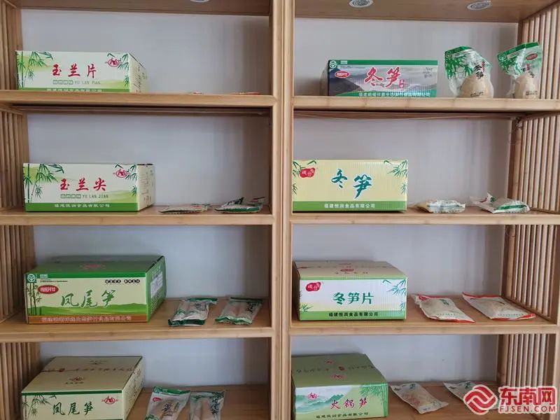 泰宁县闽笋展销中心展示的各类笋产品 当前交易市场已完成展销功能房、闽笋电商直播间、金融服务工作站、“跨村联建”党建室等设施建设,力争把大田乡笋竹资源优势转化为特色品牌优势,建设成县域内笋制品交易集中区,并逐步打造成闽赣笋制品交易中心。(记者 李少兰 陈曦) |