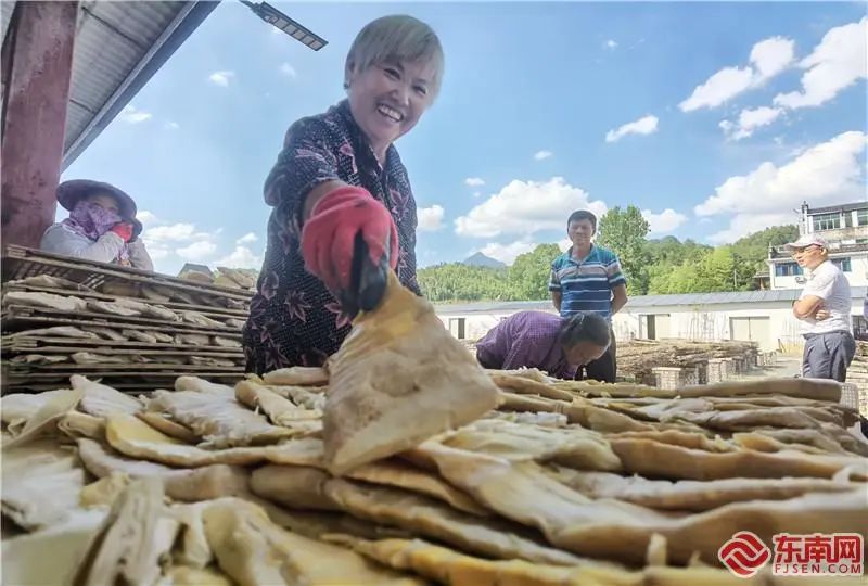 工作人员整理压榨笋,准备放进烤炉。 该闽笋交易市场所在的大田乡,现有毛竹林5万余亩,竹林价值达1360万元。交易市场采取烘烤、切片、装袋、冷藏等新型加工工艺,改变过去传统、分散、落后的加工模式,并与周边顺田食品、青源食品等笋制品加工企业合作,形成产销一体的闽笋加工产业链,带动就业300余人,产值达6000余万元。
