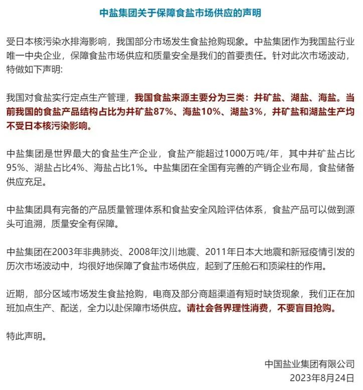 接下来,泰宁县发改局将持续关注市场供应情况,做好价格监测和保供稳价工作,请广大市民根据生活需要,理性采购食盐。 看看生产企业怎么说? · 福盐集团:没必要囤盐,福建食盐供应充足 · 日本宣布于8月24日下午启动福岛核污染水排海,引发全球关注和热议,受此影响,部分消费者对日本核污染水排海对福建省食盐供应安全的影响心存担忧。福建省盐业集团有限责任公司(以下简称福盐集团)提醒消费者,目前福建省食盐储备十分充足,市民无需恐慌,更不必效仿“囤盐”。 长期以来,福盐集团严格按照食盐的标准体系要求,建设高等级食盐定点生产企业,强化食盐产品出厂检测,建立了“一包一码”的食盐追溯体系,保障食盐质量。下一步,福盐集团将更好发挥省内食盐供应主渠道作用,继续采取有效措施,切实保障食盐市场供应和价格稳定。 · 中盐集团关于保障食盐市场供应的声明 ·