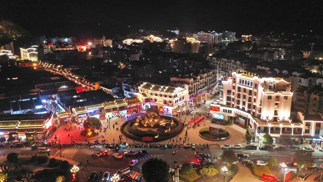 过风水车而下,穿过绣衣坊门楼,便到尚书街了。尚书街不长,可街灯柔和,再加上商户门外高悬的灯笼,大有“大红灯笼高高挂,欢迎行人到我家”之感。此街没有吆喝声,却店店都是生意。可以说,在尚书街行走,仿若走进深宅大院,让人有一种家的感觉。这种感觉非常温馨,非常和美。让舒适畅快的行人,不自觉中就在此街多走了几个来回。走在这条古街上,可以欣赏擂茶姑娘制作擂茶,也可以叫上一份擂茶,几碟果蔬,停下匆忙的脚步,端坐在古井边,品尝着古老的韵味,品味着人生难得的闲暇。 品尝擂茶之后,外来的游客大都会选择在尚书第大门前合个影,留下人生中短暂逗留的记忆。尚书第主人李春烨是泰宁大红大紫的古人,而他门前的灯光,清亮中透着红色,与古旧的大门相映而变幻出紫蓝紫蓝的色调,让这座古宅别样梦幻与神秘。 走出尚书街,来到状元文化广场。在很远处,就能听到舞乐的旋律,市民们早就在广场上、在华灯下载歌载舞了。不仅是此处,在泰宁沿河的公园,如渥丹园、黛林园、明霞园、秀水园等,晚上都聚集着广大的市民,十几人,甚或上百人,他们以舞健身,以舞来挥动泰宁的夜色,以舞来增加泰宁的律动。他们的舞姿俨然成为泰宁文化的一道亮丽风景线。 在古城“千年赋”青铜雕塑公园柔美的灯光下,三三两两的人穿行于铜像之间,这是情侣交心、谈心的场所。在变幻的、和美的灯光下,年轻人手挽着手,喃喃低语,情话绵长。在青铜雕塑公园里,不仅与恋人沟通,更是与泰宁的人文历史沟通。谈一次恋爱,就与泰宁的人文历史作一次时空穿越,这恋爱谈得伟岸,谈得颇有见地。 最最吸引人眼球的夜景,当是泰宁城区的几座桥。霓虹装扮,色彩斑斓,如梦似幻。如果可以用女性来比喻其风采,水南廊桥就像是个成熟的少妇,浓稠美艳而又不失端庄;东洲桥则是个花季少女,纯真朴素而又不失媚态;文昌廊桥如立于泰宁地博园附近的村姑,形单影只却又不失纯真,显出另类的秀丽大方;而金水桥,让人觉得她更像是新时代的女性,少了媚态多了干练。 登高才能望远,才能厘清视线。泰宁城市夜景从高处俯瞰更是一绝。五彩的灯光把夜色轻浮地一笔勾过,轻描淡写,却也风情无限。 夜市是一个城市写意的生活。泰宁人崇尚闲适,喜欢恬淡,讲究生活。朋友要来往,客人要招待。因而,入夏之后,金溪两岸,山边屋角,晚茶便上演出少有的热闹与喧嚣。