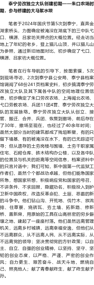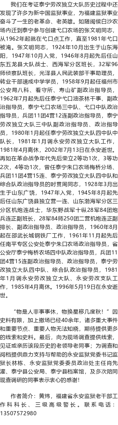 然而,福建司法行政系统公开出版发行或大众可查阅到的资料、文献、史料中几乎没有上海闽北农场的记载;关于泰宁劳改独立大队、朱口农场、弋口农场的记载也仅限收押哪里的犯人、1982年撤场等简简单单的只言片语。《福建省志·司法行政志》《当代中国监狱概览(1949——1989)》《福建监狱工作发展纪实》等内部资料中对泰宁劳改独立大队、明溪劳改支队(楼前农场)等已撤并撤迁单位的记载也只有简短的一两句事务性的记载,没有关于这些单位整段或完整篇幅的记载。 随着时间的推移,第一代福建监狱工作者都已渐渐老去、逝去,出生或成长在泰宁劳改独立大队等已撤场劳改单位的第二代监狱工作者也都已经或临近退休。知道或经历过那段光辉岁月的老领导、老同事越来越少了。靠口耳相传的新中国福建监狱故事及其中所蕴涵着的经验与教训、有着厚重内核的福建监狱精神及其元素,也渐渐变得模糊、抽象。大部分上世纪90年代末、本世纪初参加监狱工作的同志都已经不知道曾经还存在过泰宁劳改独立大队这样的单位。前辈的奋斗足迹将淹没在历史的滚滚洪流中。