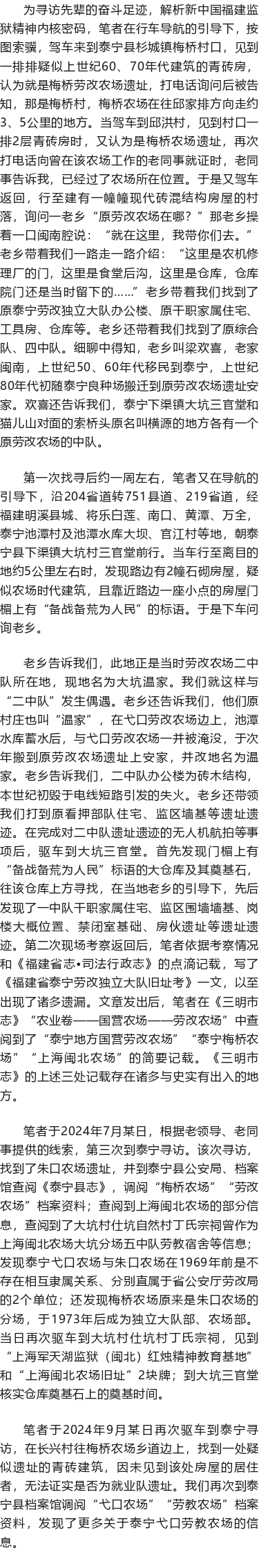 有良心和温情的自媒体 《监狱记忆》不只是历史记载的风霜雪雨 监狱人民警察桌案上的闲情雅致 她是每一位与监狱有关的事与人的前世今生 笔者上世纪90年代初参加监狱工作时经常听年长的同事说着泰宁梅桥农场、明溪楼前农场等已撤并劳改农场的故事。近年来,在参与中国监狱工作协会监狱史学专委会的课题调研和研讨中,得知上海市军天湖监狱将福建泰宁丁氏宗祠列为“红烛精神”发源地,并在浙江省监狱工作研究所所长马卫国先生建议下,上海市军天湖监狱将福建泰宁原农场的一面土墙,搬运到监狱陈列。