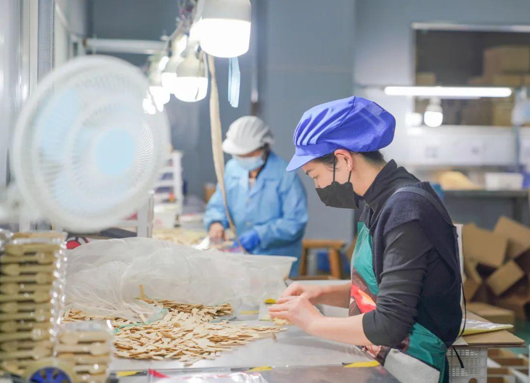 12月12日, 走进福建新创艺竹木科技有限公司厂区, 一台台生产设备马力全开, 工人们正忙着将竹料断料、开片、筛选, 加工成刀、叉、勺等产品, 赶制发往各地的订单产品。