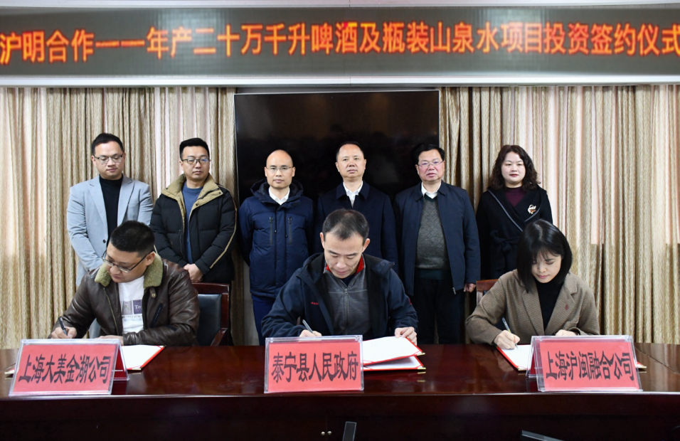 1月26日,泰宁县举行沪明合作——年产二十万升啤酒及瓶装山泉水项目投资签约仪式。县委副书记、县长王怀斌,县政协党组书记、主席江求荣出席仪式,县领导郑秀娟、许伟钢参加仪式。