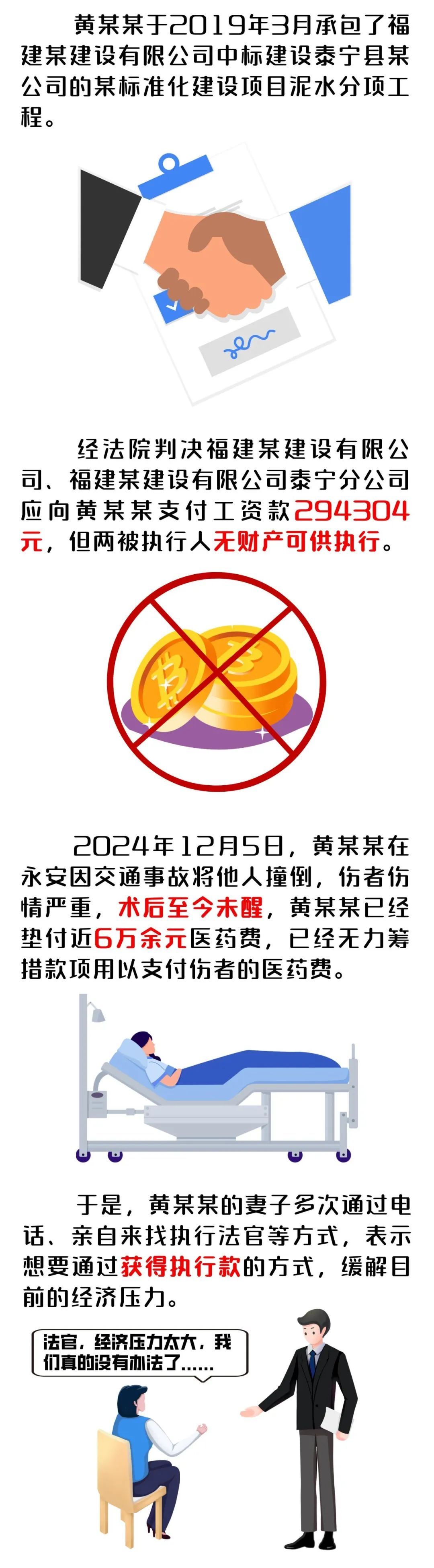 据了解,泰宁县某公司仍有部分款项未支付给福建某建设有限公司、福建某建设有限公司泰宁分公司。于是,为救助伤者,安抚黄某某一家情绪,泰宁法院与县信访局、农业农村局、民政人社局、泰宁县某公司等相关单位召开联席会议共同协商化解。