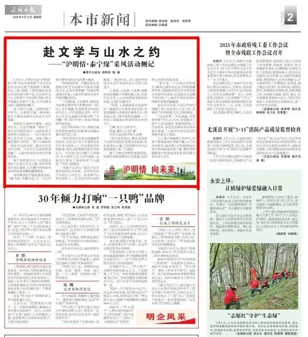 3月9日,为期5天的“沪明情·泰宁缘”知名作家看泰宁文学采风创作活动在泰宁圆满落下帷幕。来自上海、福建、三明等地的30余位知名作家齐聚于此,在自然风光与人文胜景中寻找创作灵感,用文学笔触记录泰宁之美,全方位感受这座小城独特的魅力。