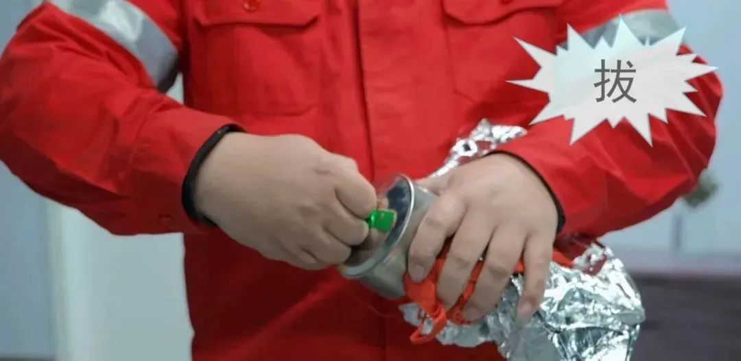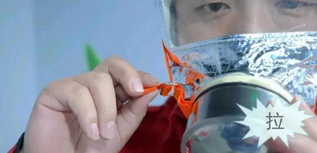 3、“套”——套在头上。用手握住罐体,将呼吸口对准口鼻处,鼻身两侧不留空隙,随后拉紧拉带。