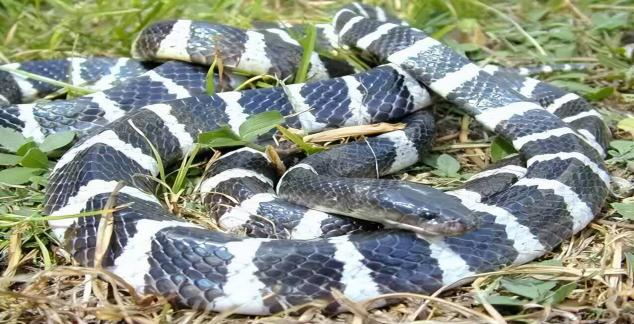 黑白环纹、椭圆头 ,在近水区、农田、菜地出没,夜行。咬伤不痛不肿!1-4小时后可致呼吸麻痹,极易延误救治。 混合毒类 眼镜蛇