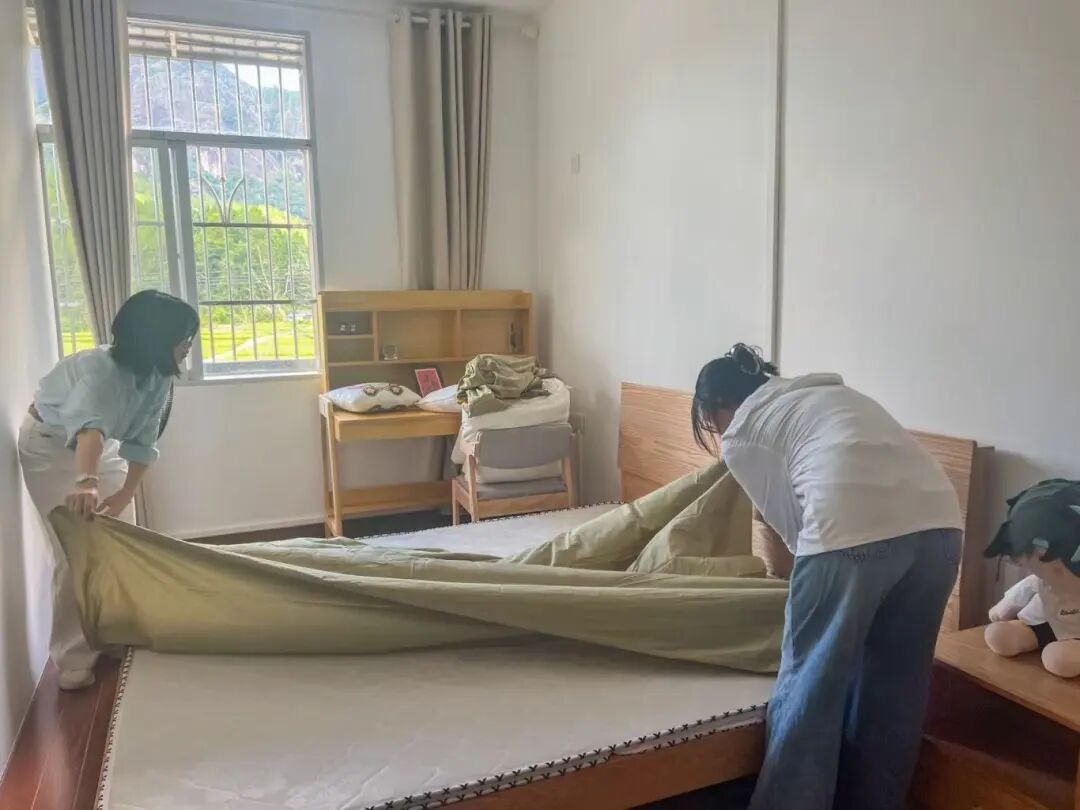 干部们分工协作,熟练地为姐弟俩换上新的床上四件套,并进行了简单的新房装饰,让他们切实感受到党和政府的关爱与温暖。 团县委副书记 黎晓妹:“我们对27名无独立居住和学习环境的困境儿童实施‘希望小屋’工程,通过改造原有住房、配备必要家具和学习用品,打造他们的独立生活空间。”