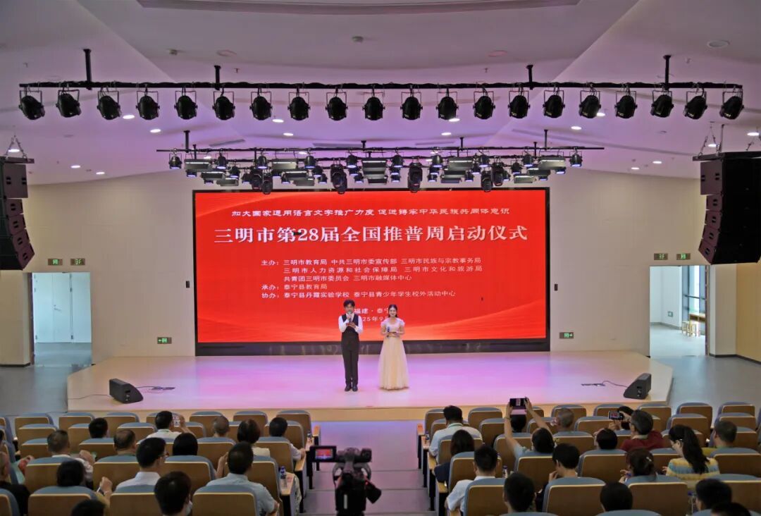 9月12日,三明市第28届全国推广普通话宣传周启动仪式在泰宁县丹霞实验学校举行。 此次活动以“加大国家通用语言文字推广力度,促进筑牢中华民族共同体意识”为主题,旨在进一步推广国家通用语言文字,弘扬中华优秀传统文化,深化文化认同,凝聚民族共识。 启动仪式上,与会嘉宾首先参观了泰宁县“书香·墨香”校园文化成果展。随后,一场震撼人心的千人诵读《论语》活动在室内体育馆盛大上演。 “学而时习之,不亦说乎……”在领诵员的带领下,千名学生齐声诵读《论语》经典篇章,宏亮而清晰的标准普通话汇成一股磅礴的声浪,展现了国家通用语言文字的规范之美和中华经典的永恒魅力。 活动现场,师生们凝神静气坐于书桌旁,挥毫泼墨,一幅幅用规范、优美的汉字书写,以推广普通话、传承经典文化为主题的书法作品跃然纸上,感受汉字书写的魅力与中华文化的深厚底蕴。 与此同时,师生中华经典诵读舞台展演更是将启动仪式推向高潮。师生们身着传统服饰或现代服装,精神饱满,声情并茂,通过独诵、合诵、吟唱、情景剧等多种艺术形式,演绎了《诗经》、《弟子规》等中华文化瑰宝以及歌颂民族团结、时代发展的现当代佳作。 诗经《采薇》 诵读《弟子规》 此次活动不仅展现了泰宁县师生优秀的语言素养和艺术才华,更深刻诠释了推广普通话在传承文化、凝聚民族精神、铸牢中华民族共同体意识中的核心作用。 课本剧《揠苗助长》 情景歌舞《诗画中国》 在此次推普周活动期间,泰宁县还将持续开展形式多样、内容丰富的语言文字宣传教育活动,进一步营造全社会学习使用国家通用语言文字、自觉传承弘扬中华优秀语言文化的良好氛围,让普通话真正成为沟通心灵的桥梁、凝聚力量的纽带。(记者 张显超 柯劭坤) |