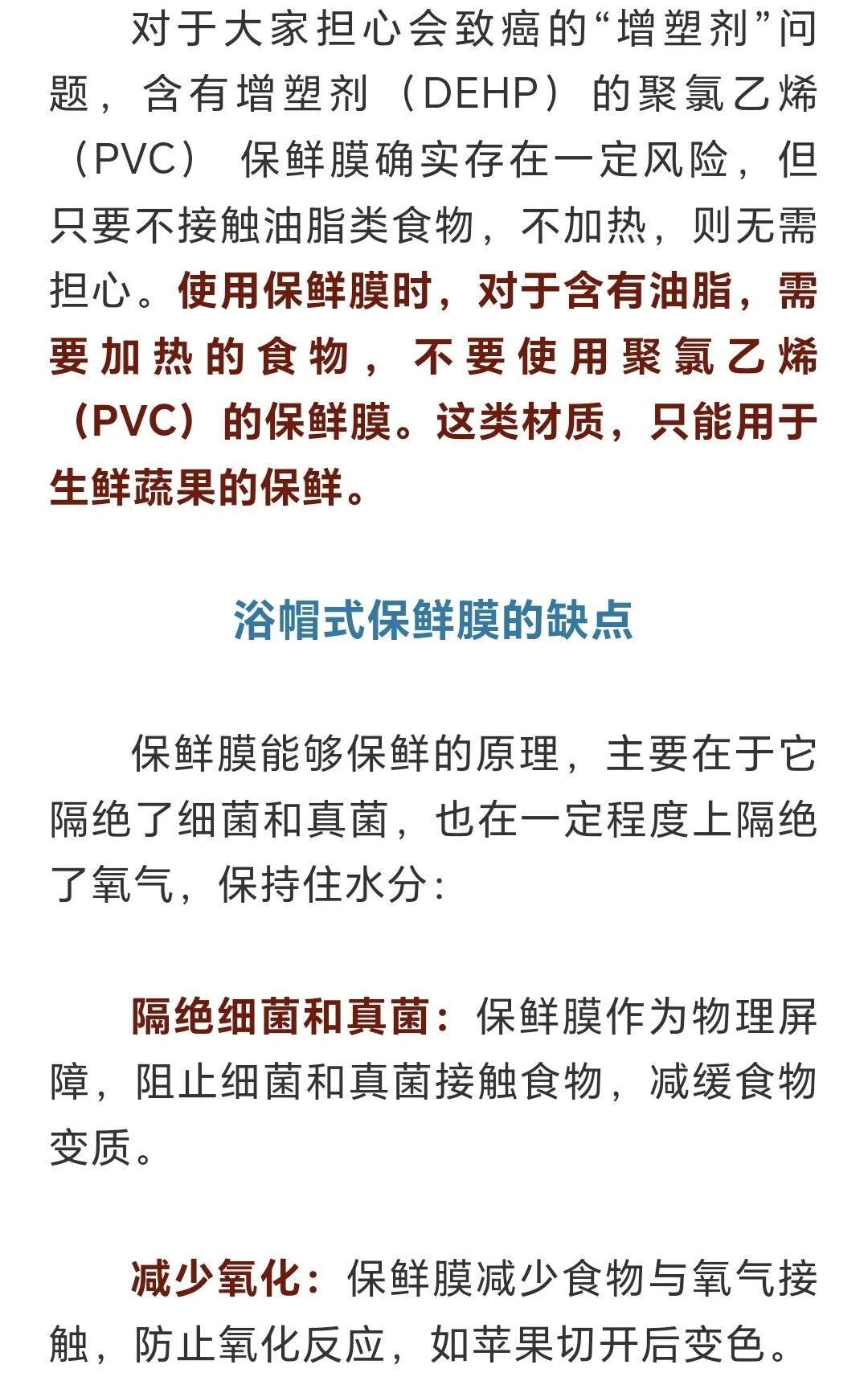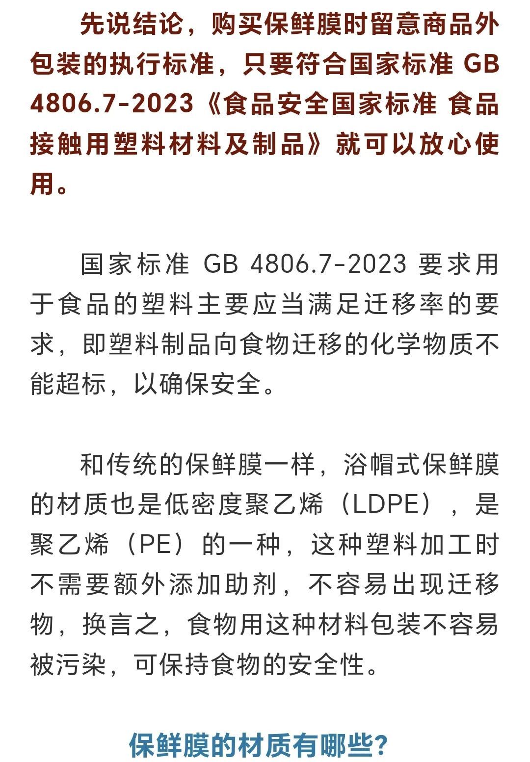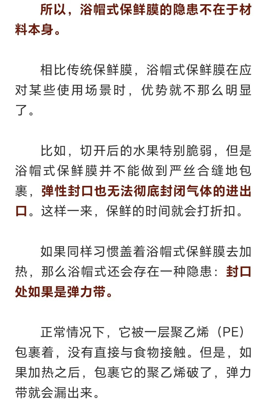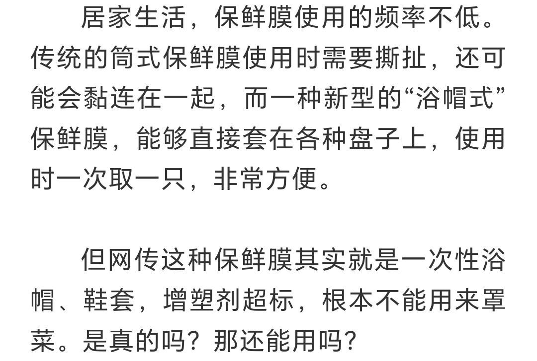 图片来源:电商平台截图 市面上常见的食品级保鲜膜材质主要有聚乙烯(PE)、聚氯乙烯(PVC)、聚偏二氯乙烯(PVDC)和其他生物降解材料。我们总结了材质特点和使用注意事项↓ 保持水分:保鲜膜减缓食物水分蒸发,保持食物新鲜和口感。 总结: 新型的浴帽式保鲜膜很方便,但消费者要谨防个别商家将普通塑料材质的浴帽冒充保鲜膜来进行售卖,提前了解清楚产品的材质、执行标准及使用环境。 另外,在具体使用的过程中,需要注意: 1.给特别脆弱的食物保鲜时,注意不要久放。 2.在微波炉加热食物的时候,要把保鲜膜摘掉,避免不利影响。 |