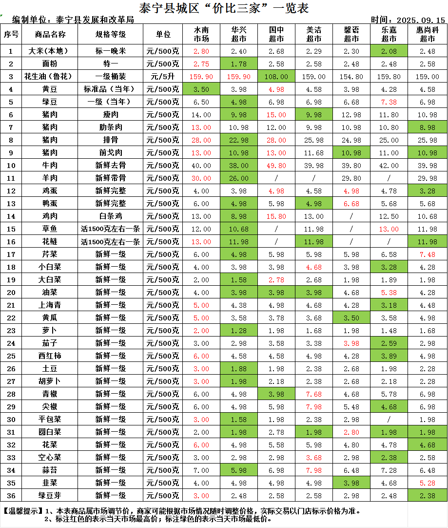 以下货品仅限当天价格,标注绿色的图文框表示当天的最低价,红色的为当天最高价。