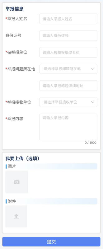 点击【我要举报】, 阅读举报须知后进入信息填写页面, 即可填写举报内容。