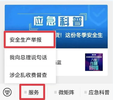 或关注“应急管理部”微信公众号, 通过底部菜单栏【服务】 选择【安全生产举报】, 进入举报平台。