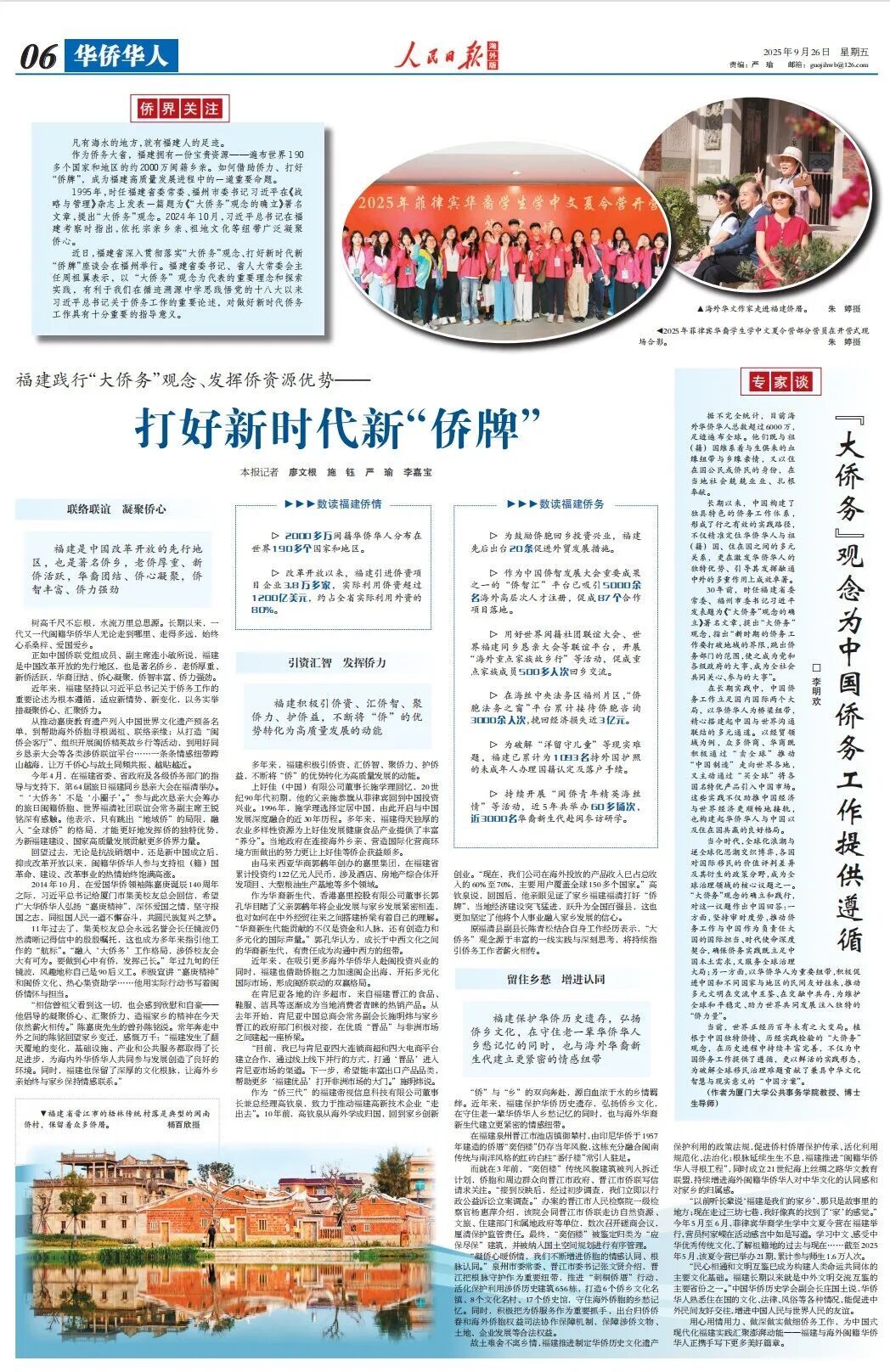 9月26日,人民日报海外版华侨华人版整版报道点赞福建侨务工作!头条刊登《福建践行“大侨务”观念、发挥侨资源优势——打好新时代新“侨牌”》通讯,聚焦福建省深入贯彻落实“大侨务”观念、打好新时代新“侨牌”座谈会精神,借助侨力、打好“侨牌”;“专家谈”栏目刊发《“大侨务”观念为中国侨务工作提供遵循》。 福建践行“大侨务”观念、发挥侨资源优势—— 打好新时代新“侨牌” 记者 廖文根 施钰 严瑜 李嘉宝 2025年菲律宾华裔学生学中文夏令营部分营员在开营式现场合影。朱婷摄 海外华文作家走进福建侨厝。朱婷摄 福建省晋江市的梧林传统村落是典型的闽南侨村,保留着众多侨厝。杨百欣摄 凡有海水的地方,就有福建人的足迹。 作为侨务大省,福建拥有一份宝贵资源——遍布世界190多个国家和地区的约2000万闽籍乡亲。如何借助侨力、打好“侨牌”,成为福建高质量发展进程中的一道重要命题。 1995年,时任福建省委常委、福州市委书记习近平在《战略与管理》杂志上发表一篇题为《“大侨务”观念的确立》署名文章,提出“大侨务”观念。2024年10月,习近平总书记在福建考察时指出,依托宗亲乡亲、祖地文化等纽带广泛凝聚侨心。 近日,福建省深入贯彻落实“大侨务”观念、打好新时代新“侨牌”座谈会在福州举行。福建省委书记、省人大常委会主任周祖翼表示,以“大侨务”观念为代表的重要理念和探索实践,有利于我们在循迹溯源中学思践悟党的十八大以来习近平总书记关于侨务工作的重要论述,对做好新时代侨务工作具有十分重要的指导意义。 联络联谊 凝聚侨心 福建是中国改革开放的先行地区,也是著名侨乡,老侨厚重、新侨活跃,华裔团结、侨心凝聚,侨智丰富、侨力强劲 树高千尺不忘根,水流万里总思源。长期以来,一代又一代闽籍华侨华人无论走到哪里、走得多远,始终心系桑梓、爱国爱乡。 正如中国侨联党组成员、副主席连小敏所说,福建是中国改革开放的先行地区,也是著名侨乡,老侨厚重、新侨活跃,华裔团结、侨心凝聚,侨智丰富、侨力强劲。 近年来,福建坚持以习近平总书记关于侨务工作的重要论述为根本遵循,适应新情势、新变化,以务实举措凝聚侨心、汇聚侨力。 从推动嘉庚教育遗产列入中国世界文化遗产预备名单,到帮助海外侨胞寻根谒祖、联络亲缘;从打造“闽侨会客厅”、组织开展闽侨精英故乡行等活动,到用好同乡恳亲大会等各类涉侨联谊平台……一条条情感纽带跨山越海,让万千侨心与故土同频共振、越贴越近。 今年4月,在福建省委、省政府及各级侨务部门的指导与支持下,第64届旅日福建同乡恳亲大会在福清举办。“‘大侨务’不是‘小圈子’。”参与此次恳亲大会筹办的旅日闽籍侨胞、世界福清社团联谊会常务副主席王锐铭深有感触。他表示,只有跳出“地域侨”的局限,融入“全球侨”的格局,才能更好地发挥侨的独特优势,为新福建建设、国家高质量发展贡献更多侨界力量。 回望过去,无论是抗战硝烟中,还是新中国成立后,抑或改革开放以来,闽籍华侨华人参与支持祖(籍)国革命、建设、改革事业的热情始终饱满高涨。 2014年10月,在爱国华侨领袖陈嘉庚诞辰140周年之际,习近平总书记给厦门市集美校友总会回信,希望广大华侨华人弘扬“嘉庚精神”,深怀爱国之情,坚守报国之志,同祖国人民一道不懈奋斗,共圆民族复兴之梦。 11年过去了,集美校友总会永远名誉会长任镜波仍然清晰记得信中的殷殷嘱托,这也成为多年来指引他工作的“航标”。“融入‘大侨务’工作格局,涉侨校友会大有可为。要做到心中有侨,发挥己长。”年过九旬的任镜波,风趣地称自己是90后义工。积极宣讲“嘉庚精神”和闽侨文化、热心集资助学……他用实际行动书写着闽侨情怀与担当。 “相信曾祖父看到这一切,也会感到欣慰和自豪——他倡导的凝聚侨心、汇聚侨力、造福家乡的精神在今天依然薪火相传。”陈嘉庚先生的曾孙陈铭说。常年奔走中外之间的陈铭回望家乡变迁,感慨万千:“福建发生了翻天覆地的变化,基础设施、产业和公共服务都取得了长足进步,为海内外华侨华人共同参与发展创造了良好的环境。同时,福建也保留了深厚的文化根脉,让海外乡亲始终与家乡保持情感联系。” 引资汇智 发挥侨力 福建积极引侨资、汇侨智、聚侨力、护侨益,不断将“侨”的优势转化为高质量发展的动能 多年来,福建积极引侨资、汇侨智、聚侨力、护侨益,不断将“侨”的优势转化为高质量发展的动能。 上好佳(中国)有限公司董事长施学理回忆,20世纪90年代初期,他的父亲施恭旗从菲律宾回到中国投资兴业。1996年,施学理选择定居中国,由此开启与中国发展深度融合的近30年历程。多年来,福建得天独厚的农业多样性资源为上好佳发展健康食品产业提供了丰富“养分”。当地政府在连接海外乡亲、营造国际化营商环境方面做出的努力更让上好佳等侨企获益颇多。 由马来西亚华商郭鹤年创办的嘉里集团,在福建省累计投资约122亿元人民币,涉及酒店、房地产综合体开发项目、大型粮油生产基地等多个领域。 作为华裔新生代,香港嘉里控股有限公司董事长郭孔华目睹了父亲郭鹤年将企业发展与家乡发展紧密相连,也对如何在中外经贸往来之间搭建桥梁有着自己的理解。“华裔新生代能贡献的不仅是资金和