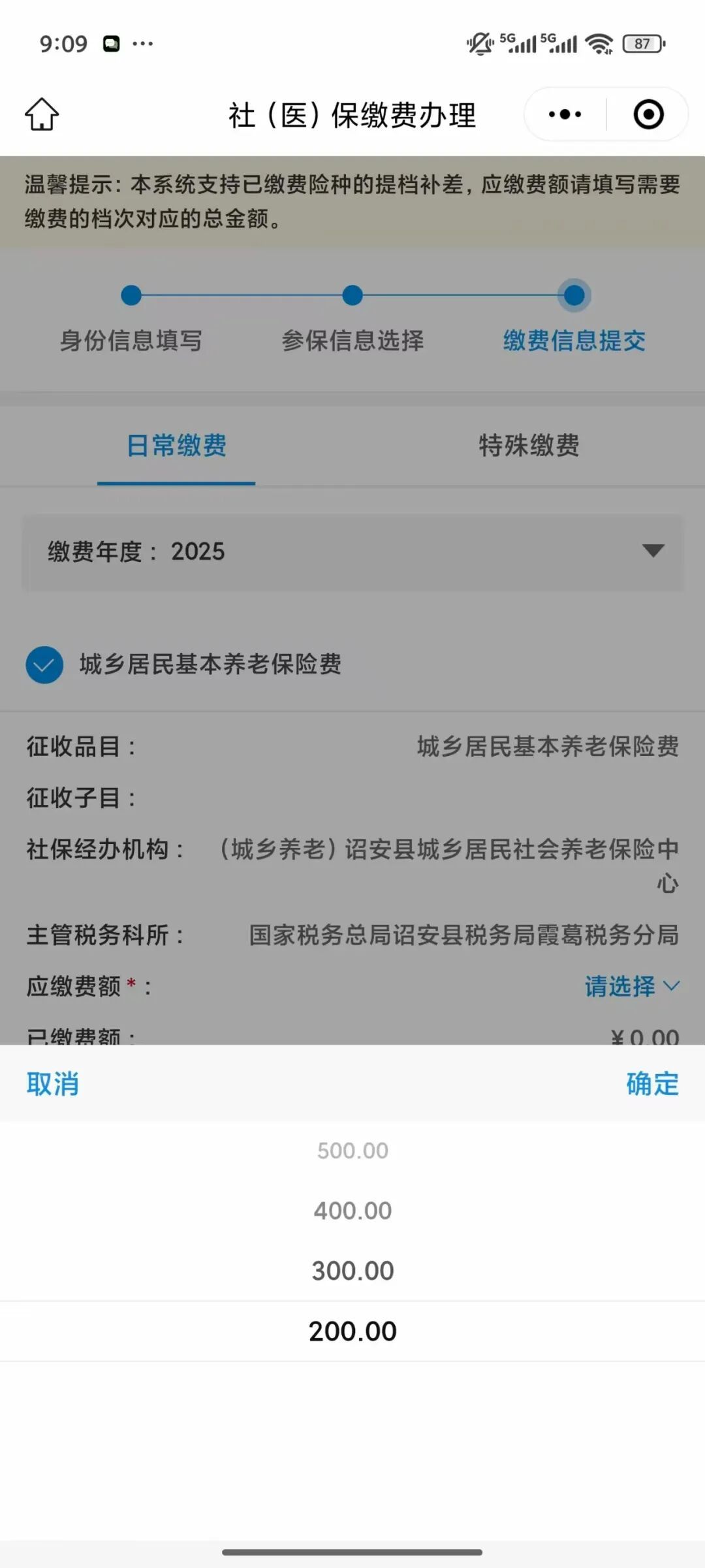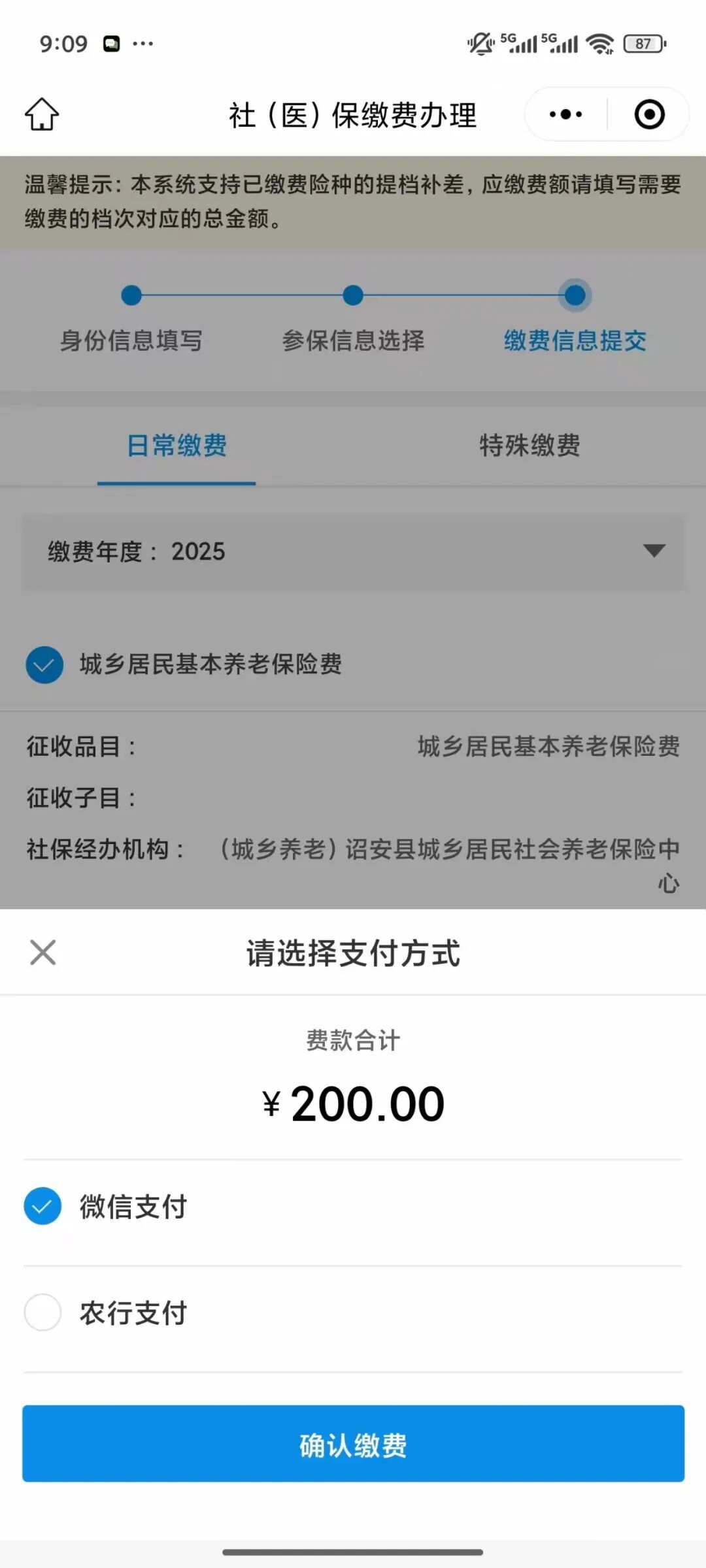 2025年度城乡居民基本养老保险已经可以开始缴费了。只要您办理过参保登记,就可以通过手机端办理缴费了,还可以自主选择缴费档次,比过去银行批扣的方式更灵活更便捷: 微信搜索并关注“福建税务”公众号,点击底部菜单栏“微办税”——“医保社保业务” 系统直接跳转至办费页面,点击“个人社(医)保缴费办理”,进行身份信息确认,若为他人办理,点击“办理对象”下拉框,选择“他人”,输入姓名和身份证号码,点击“下一步”。 在参保信息选择界面,勾选城乡居民基本养老保险费,点击“应缴费额”,选择您需要缴费的档次,核对各项缴费信息无误后提交缴费信息,确认缴费并支付即可。 此外也可以通过闽政通APP、支付宝小程序等线上渠道以及办税服务厅、农业银行和农信社(农商银行)等线下渠道办理缴费。您也可以扫描下方二维码进行缴费。 城乡居民养老保险并不是只有200元一个缴费档次,而是有 200 元到 3000 元共 12 个档次,每个地市还会根据实际情况增加缴费档次,您可以根据自身需要选择。 热点问答 问:是按年缴费好还是到60周岁前一次性补缴好呢? 答:按年缴费每年有政府补贴,而到60周岁前一次性补缴则没有这块补贴。如果您选择200元档次,政府补贴每年给您补贴 40 元,如果您选择最高的3000元档次,政府补贴每年补贴200元。 具体金额如下 另外,村集体、社会组织或个人每年还可以通过集体补助或社会资助的方式补充缴费,最高补助金额不超过当地最高档次标准就可以了。简单的说,如果您今年已经交了3000元费款,还可以通过集体补助或社会资助再交3000元。 问:城乡居民养老保险要缴几年才能领取养老金啊?如果到60周岁的时候缴费年限不够,能不能一次性缴费后领取养老金啊? 答:城乡居民养老保险按年缴费,每年12月25日前缴纳当年费款,达到60周岁并至少缴满 15 年就可以领取养老金,而且城乡居民养老保险缴费比较灵活,如果您到60周岁没缴满15年,也可以一次性缴费满15年后领取养老金。 问:每个月能领多少养老金啊? 答:养老金包含基础养老金和个人账户养老金分两部分,基础养老金由财政发放,各地标准不同,2025年我省最低基础养老金标准约为每月 190元,各地实际领取金额可能更高,而且会逐步调高;个人账户养老金包含缴费人每年缴费金额、政府补贴、集体补助等,除以 139,就是您每个月领取的个人账户养老金了。简单说,养老金 = 基础养老金 + 个人账户金额÷139。那么,满60周岁后能领多少钱呢,我们举例说明: (以上养老金金额为固定假设条件下的预测值,实际领取金额以社保经办机构核定为准。) 所以交的年限越久,交的档次越高,领取的养老金也越高,而且还有利息,可以终身领取。还在等什么,赶紧拿起您的手机缴费吧! |