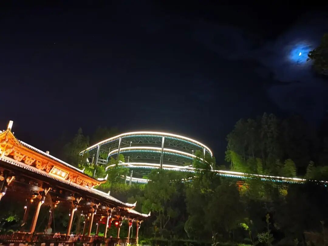 玻璃栈道悬于峡谷之上, 月光穿透竹影, 在丹崖刻下斑驳诗行。 萤火虫衔来星屑, 与水中月影跳一支圆舞曲, 恰似“月出惊山鸟,时鸣春涧中”。