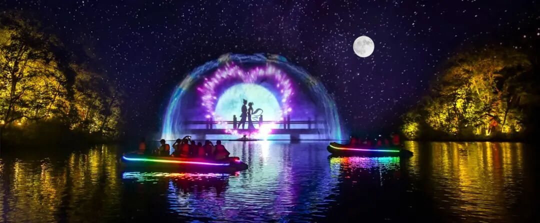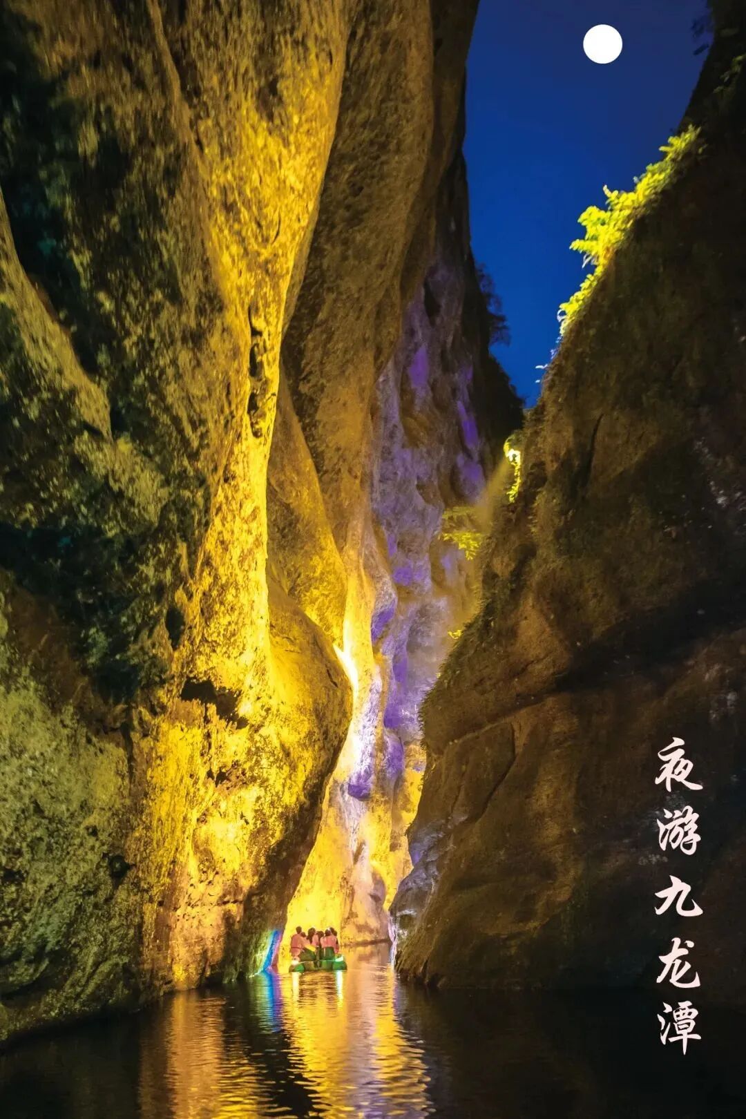 九龙潭 夜游秘境,月栖丹崖 夜幕下的九龙潭静谧而神秘, 月光穿透潭面薄雾, 如仙境般梦幻。 乘一叶小舟穿行其间, 仿佛进入月光打造的童话世界。