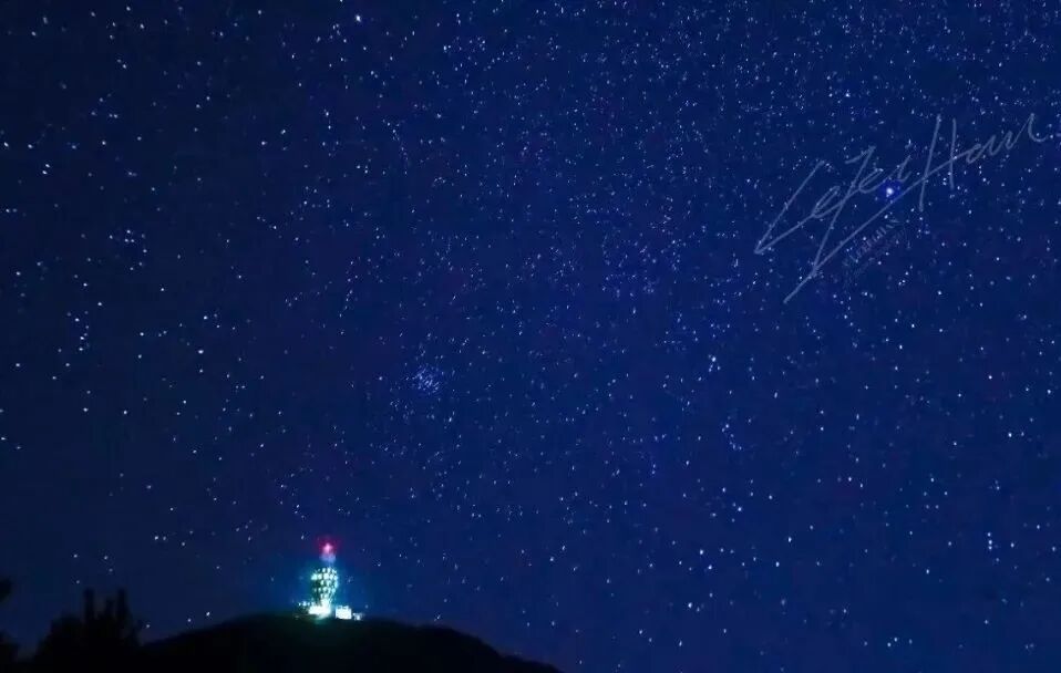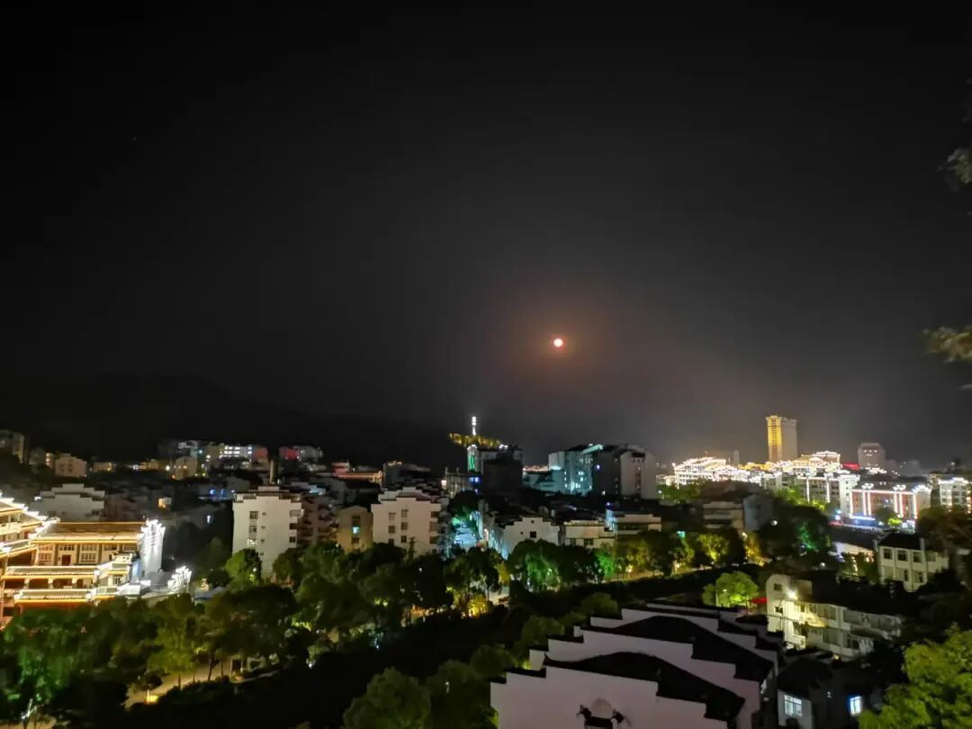 登顶时, 眼前的月亮格外明亮, 山下小城灯火点点, 与天上星河相映成趣。