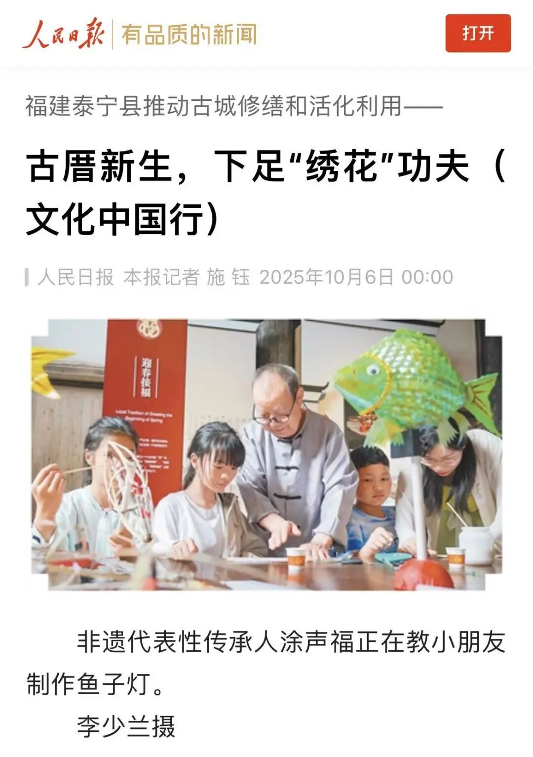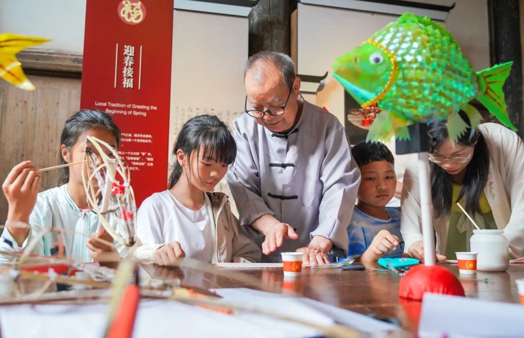 非遗代表性传承人涂声福教小朋友制作鱼子灯 古城之外,非遗传承工作也在进行。肖秋红介绍,泰宁县于去年全面启动非遗代表性传承人队伍建设。一方面,发动中小学教师学习、传承本地非遗,打造年轻传承队伍,也为非遗进校园培养师资队伍;另一方面,走进老年大学,面向老年人开班授课,组建非遗展示队伍,扩大非遗展示覆盖面。 “我们在传承好优秀传统剧目、开展常态化公益演出的同时,也在探索将梅林戏与舞蹈、流行音乐等其他艺术表现形式结合,创作更新鲜的节目,努力让更多人爱上梅林戏。”泰宁县梅林戏艺术传承保护中心主任毛清标说。 “古城的文化味回来了,人气也回来了。”这两年,梁光葵的弟弟、“梁氏拓印装裱”非遗代表性传承人梁光葆在自家祖厝里,接待了许多参观的游客。