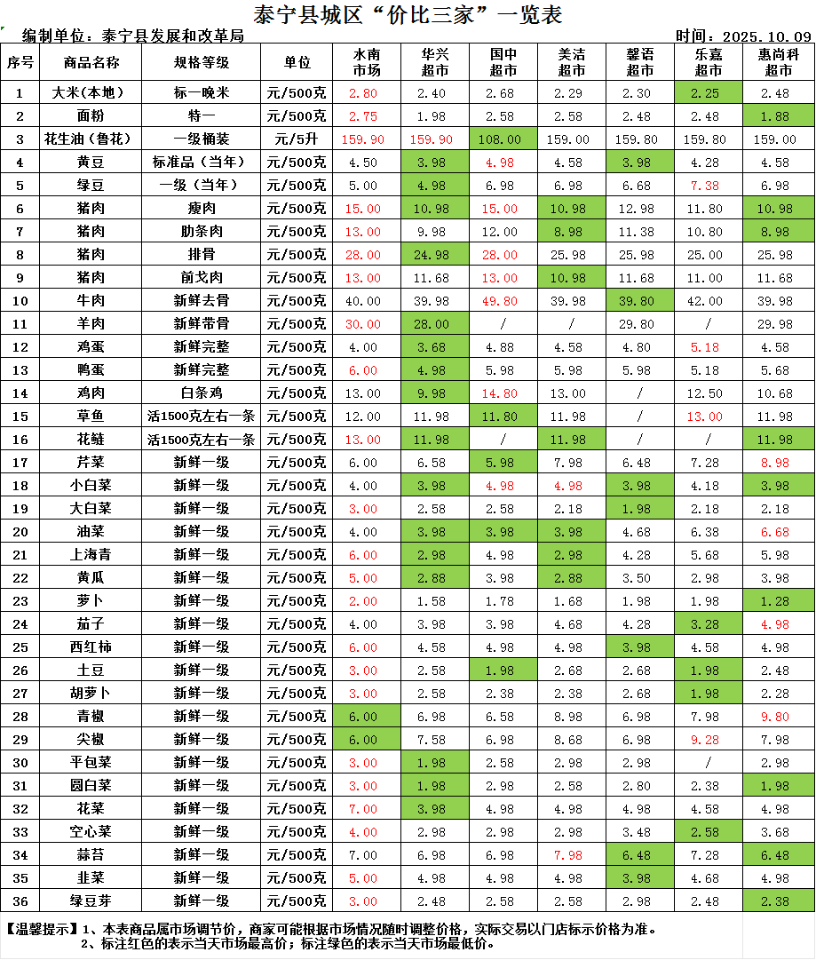 以下货品仅限当天价格,标注绿色的图文框表示当天的最低价,红色的为当天最高价。