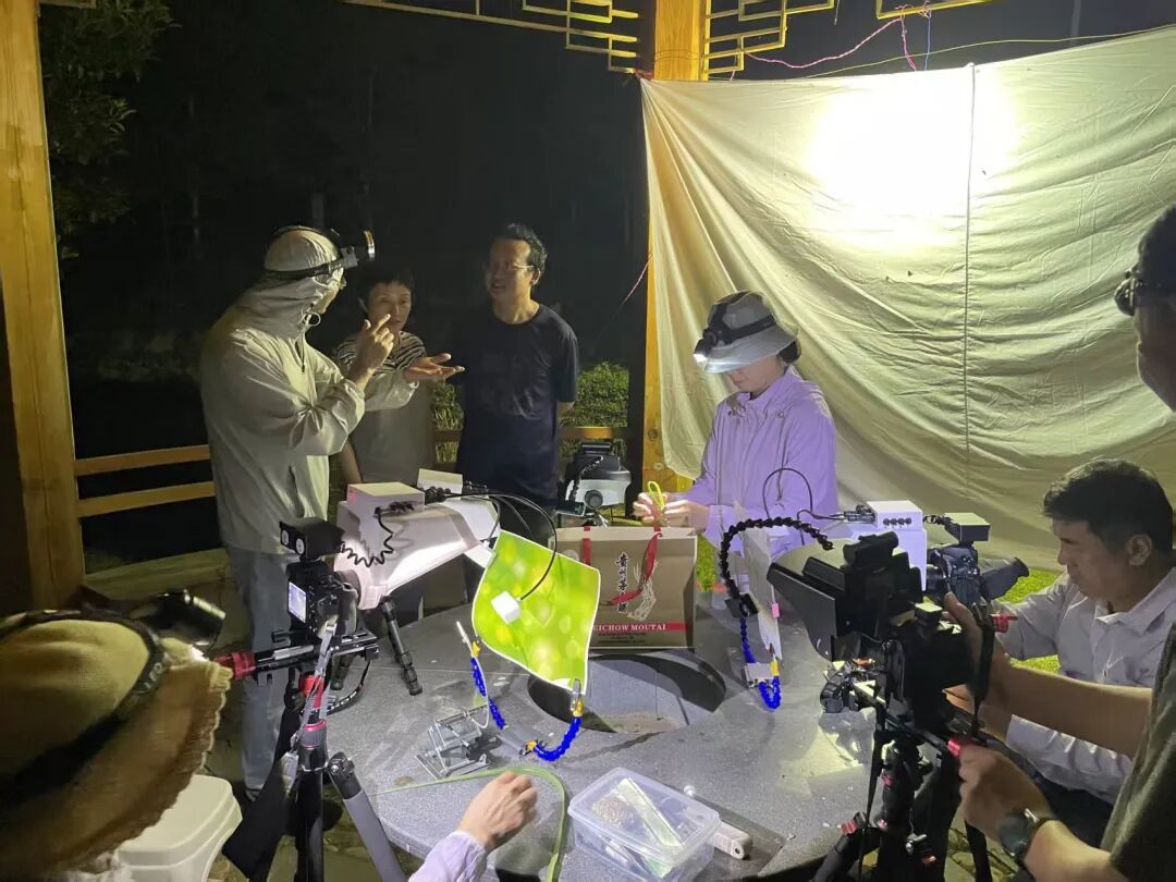 ▲昆虫摄影爱好者研究昆虫 大源村落平均海拔约800米,紧靠海拔1714米的国家级自然保护区峨嵋峰,区内密林环绕、溪流清澈,人为干扰少,成为多种微昆虫的理想栖息地。