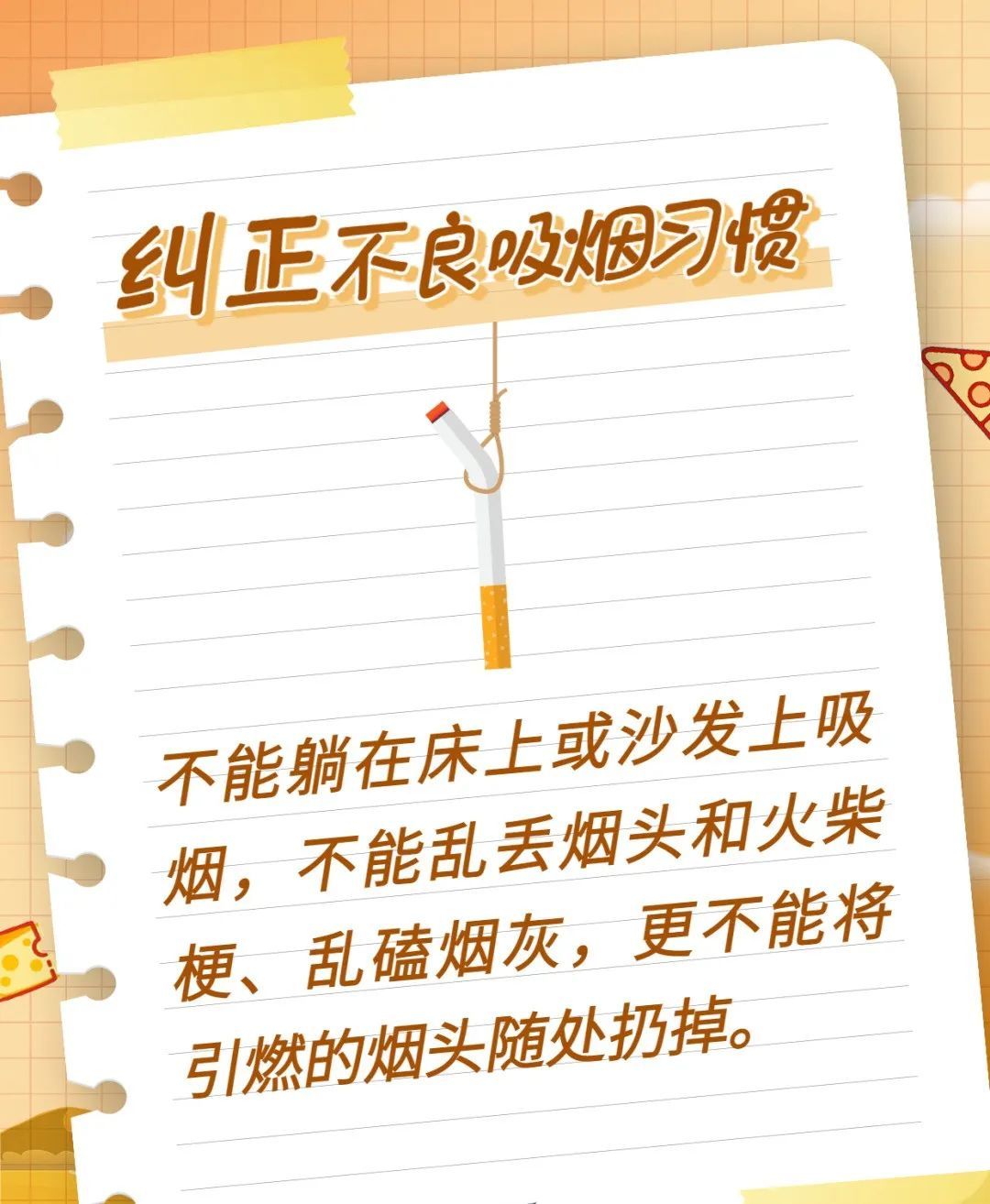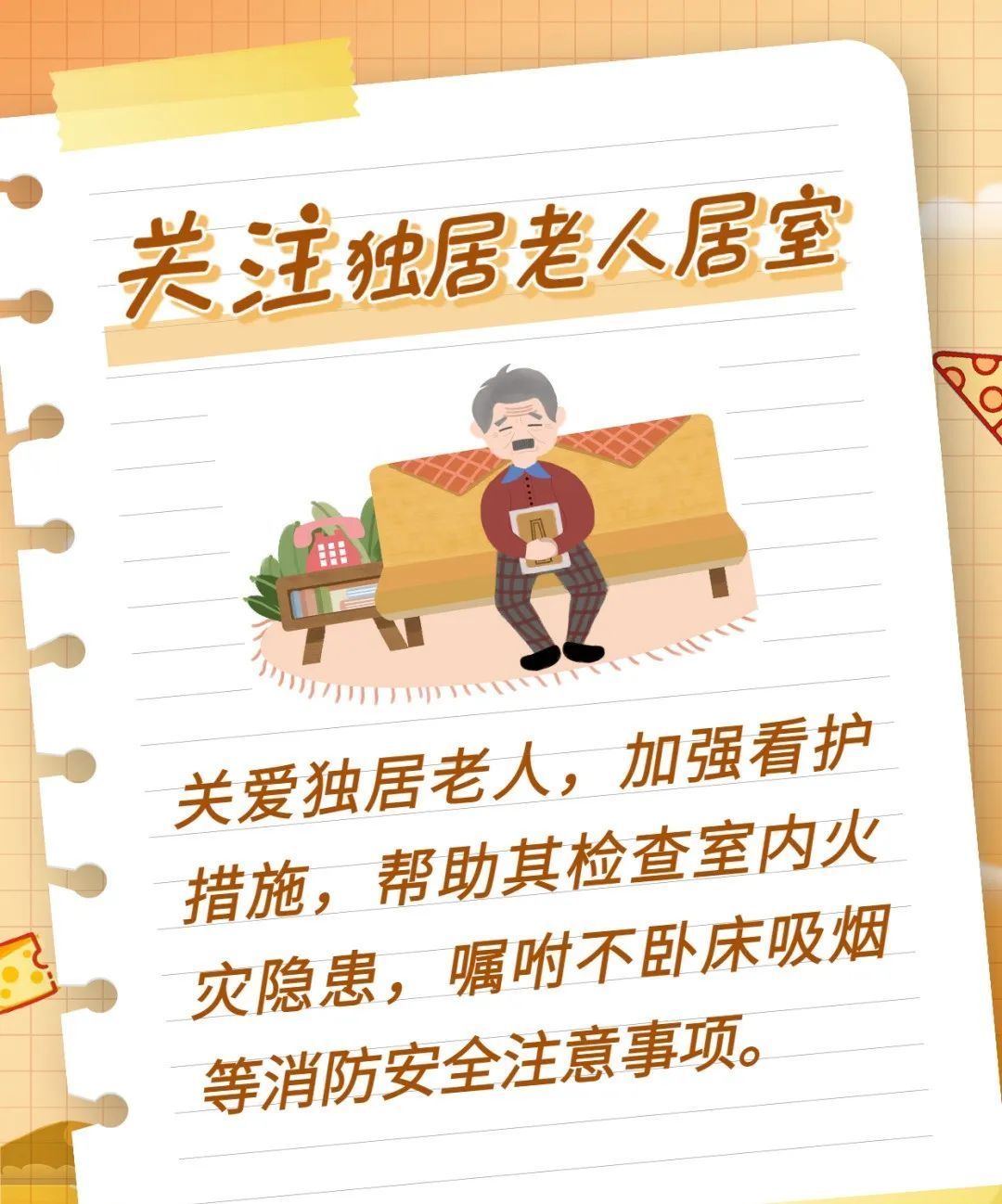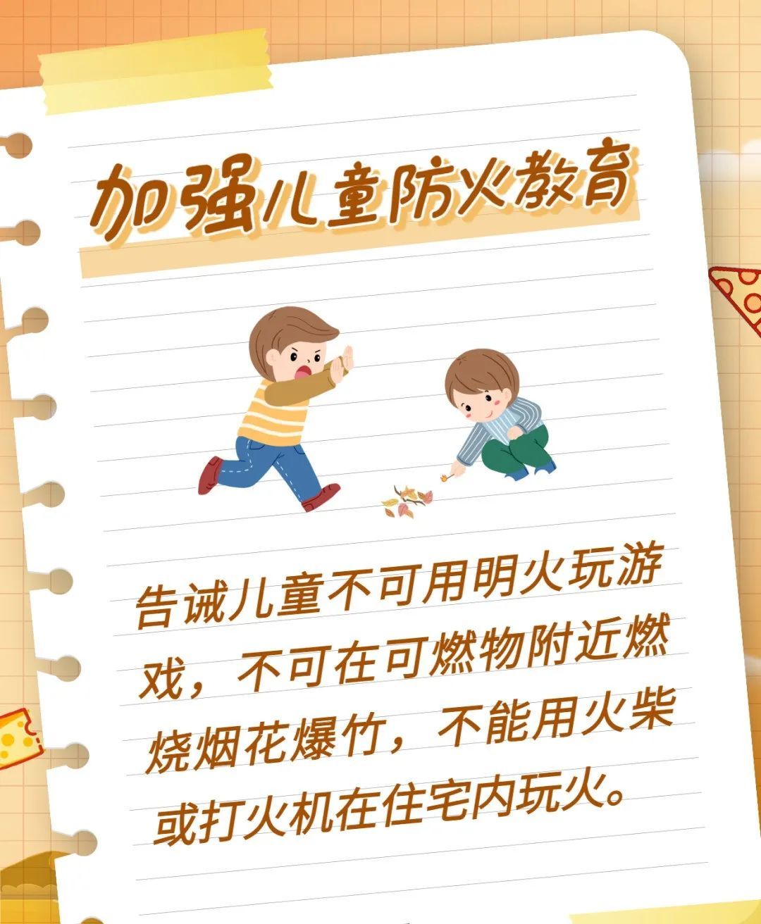 为有效预防和减少火灾事故发生 请牢记这些防火常识! 秋季防火要注意 温馨提醒 秋季草木枯黄,落叶缤纷,一经“秋风扫落叶”,很快就堆积起来,一旦遇到火苗容易发生火灾。 温馨提醒 深秋来临之前,要仔细检查存放一夏天的暖手宝、电热毯等家用电器产品是否完好,电阻丝是否被折,绝缘是否出现老化或破损等情况。 温馨提醒 秋天空气湿度相对较低,保暖背心、化纤衣物、毛衣等容易产生静电。而静电对存放易燃易爆物品的场所是极其危险的,极易导致火灾甚至爆炸事故的发生。 温馨提醒 秋季风干物燥,因而提高了物品的燃烧性能。家中的楼梯口、阳台等通道堆放杂物时,要及时清理。防止火灾发生时,影响人员疏散逃生。 温馨提醒 秋游烧烤、野炊时,周边不要有过多的灌木或有茂密的树木。结束后要采用水浇、踩踏等方式彻底熄灭炭火,避免产生阴燃。一旦起火,火借风势,风助火威,衰草满地,容易造成“火烧连营”的惨剧。 下面这份秋季防火自查图鉴,请收好 |