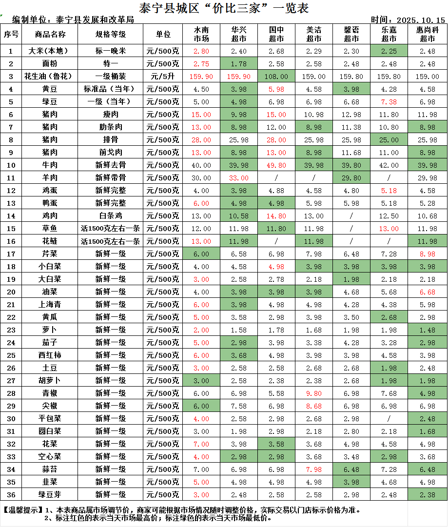 近期,为做好重要民生商品保障需求,保持市场价格稳定,维护正常市场秩序,县发改局从城区水南市场、华兴超市、国中超市、美洁超市、馨语超市、乐嘉超市、惠尚科超市抽取当天36种商品的价格,通过价格对比,让广大市民直观地看到货品价格。