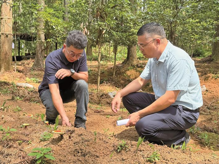 破土而出的灵芝 如今林下成了“绿色矿山”:走过灵芝圃,只见赤灵芝伞盖色泽鲜亮,形态饱满,这5亩灵芝圃当季采收新鲜灵芝约500公斤,实现产值7.5万元。 截至目前,林场林下种植1000亩,今年新增288亩,发展铁皮石斛、黄精、灵芝等“福九味”道地中药材及福建土砂仁、牛奶根等10余种中药类食材,为林农提供可看、可学、可借鉴复制的国有林场试点样板。 科技支撑强化“四库”功能 库,意味着丰足、充盈,蕴含着稳定、持久。科学种养,是让“库”源源不竭的个中要义。 如何把这天赐的潜力做强、希望做大? 泰宁国有林场给出了自己的解题思路——主动引入现代科技,与中国林科院亚热带林业研究所、三明市农科院等相关科研单位合作,引种林下作物新品种,优化种植管理技术,对接上下游产业链,共同提升产品附加值。 8月的一天,示范基地里一场实地授课正在进行。