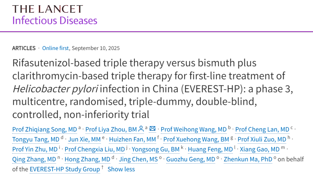 | 当全家人围坐一起共享美食,当三五好友相约推杯换盏,一种看不见的健康威胁——幽门螺杆菌,可能正悄然逼近。它通过饮食传播,已感染我国近一半人口、七成家庭,与很多常见多发病,尤其是约八成胃癌、溃疡、萎缩性胃炎等密切相关,是我国重要的卫生健康问题。 如今,这一严峻的公共卫生难题有了破解之钥:北京大学第三医院消化科周丽雅/宋志强教授团队带领全国40家医疗机构消化疾病诊疗中心研究发现,含利福特尼唑的三联方案,让幽门螺杆菌治疗有望重新回归更简便的三联方案时代,为全球幽门螺杆菌感染者带来了全新的治疗选择。相关成果日前于《柳叶刀-感染病学》在线发表。