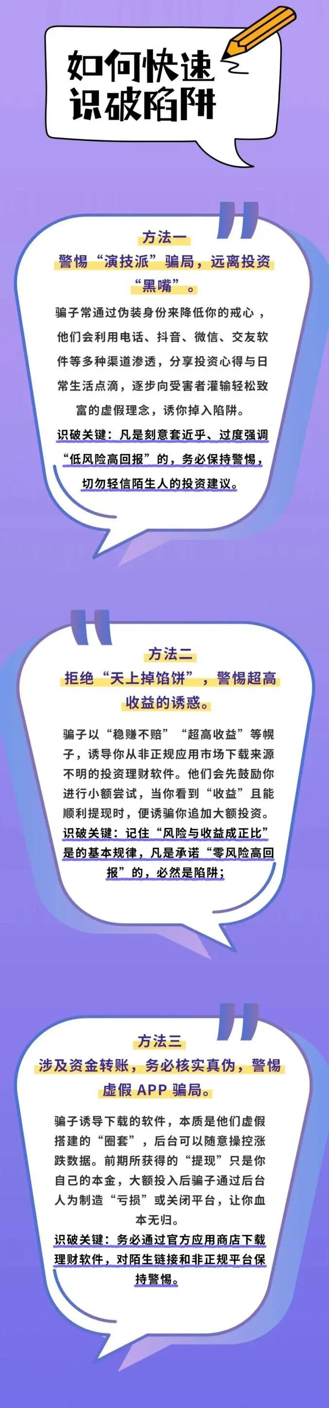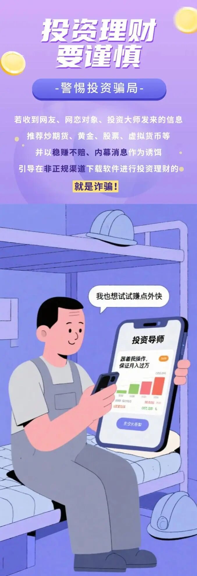 当下 理财投资热潮持续升温 股票、基金已成为大多数人 资产配置的重要选择 然而,随之而来的虚假投资理财类骗局 也呈现高发态势 “投资理财”被骗主要因素是投资者自身缺乏专业知识、贪婪心理作祟、风险意识淡薄、信息鉴别能力差,其次是因为诈骗手段多样、虚假包装与宣传、精准营销与心理操控。 从“躺赚”到“躺枪”——警惕投资理财骗局 近日,居民王先生报警称自己被骗了。经了解,王先生在8月初浏览网站时不小心点了一个广告链接,好奇心作祟驱使王先生添加了客服微信,咨询投资返现的相关事宜。