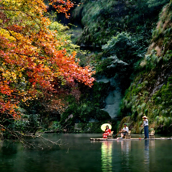 若想换种视角, 不妨乘上九龙潭的竹筏, 看奶白色的雾气与朱红色的崖壁相拥, 连冷风都变得温柔起来, 随手一拍都是水墨长卷般的大片。