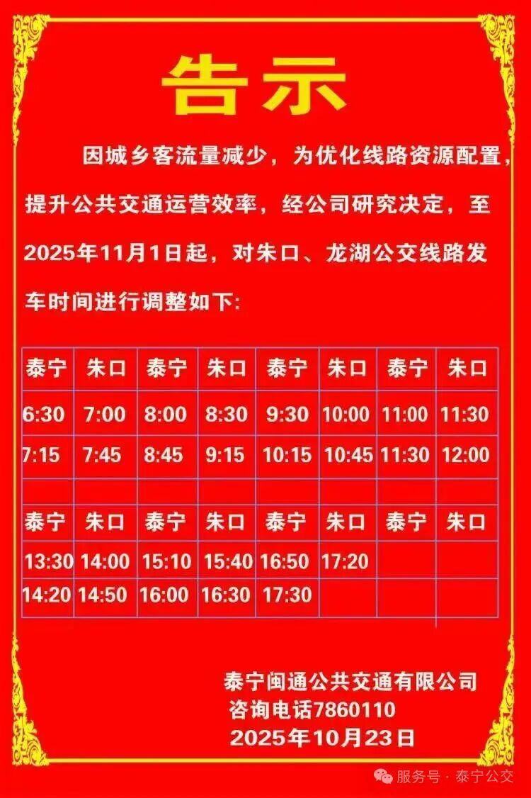 11月1日起,泰宁县朱口公交线路调整