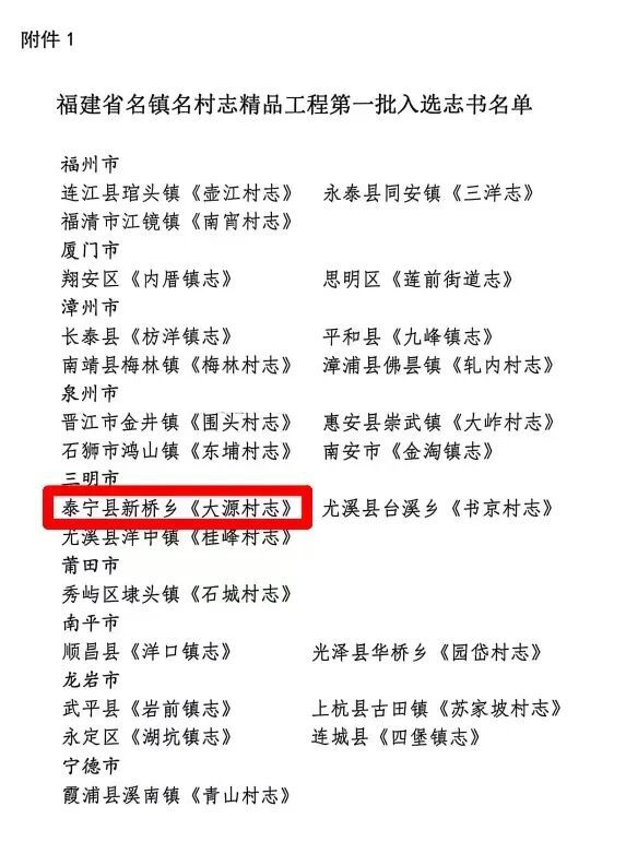 近日,中共福建省委党史方志办公布福建省名镇名村志精品工程第一批志书名单,泰宁县新桥乡《大源村志》成功上榜。