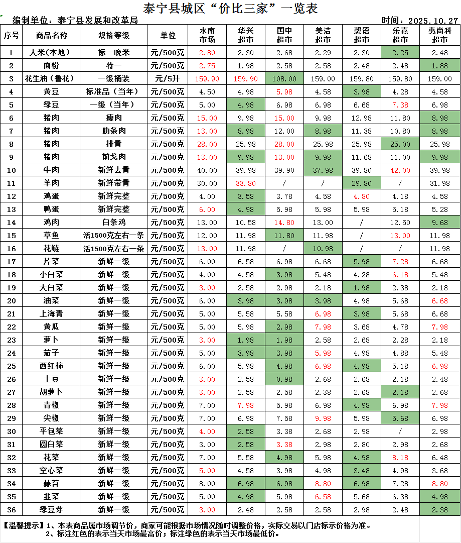 以下货品仅限当天价格,标注绿色的图文框表示当天的最低价,红色的为当天最高价。