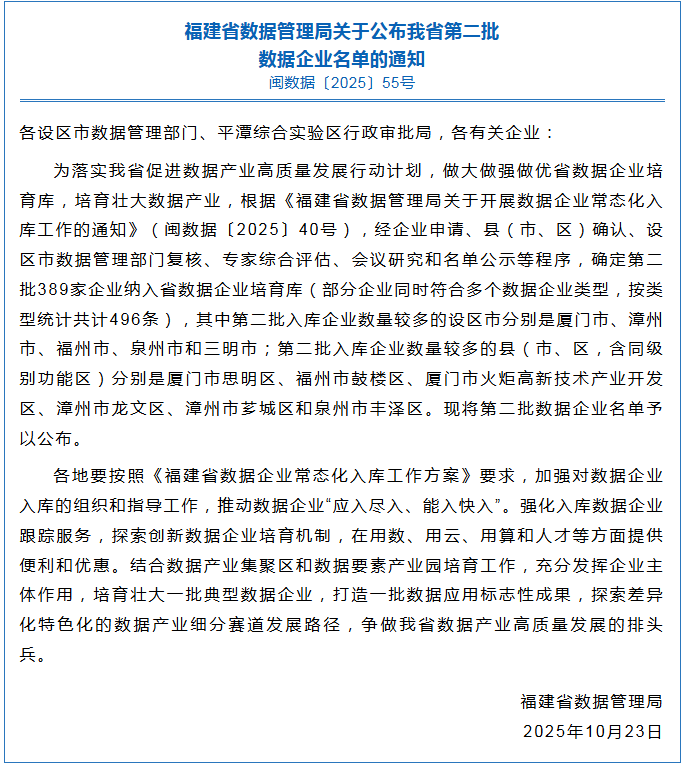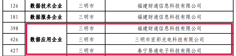 近日, 省数据管理局公布了 全省第二批数据企业名单, 泰宁县3家企业 成功入选省数据企业培育库。 分别是—— 福建财通信息科技有限公司 三明市宏彩光电科技有限公司 泰宁易通电子科技有限公司 其中,福建财通信息科技有限公司同时符合数据服务企业,数据应用企业,数据技术企业等3个数据企业类型,即按类型统计,泰宁县共计5条数据企业信息纳入省数据企业培育库。