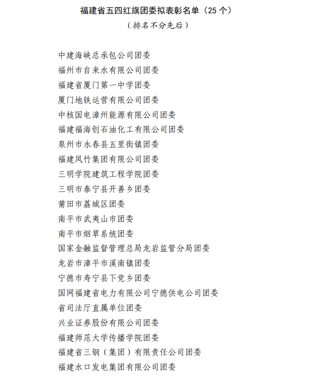 根据《关于开展2025年度福建青年五四奖章、福建新时代青年先锋、福建省五四红旗团委(团支部)、福建省优秀共青团员、福建省优秀共青团干部评选表彰的通知》精神,经研究,拟表彰2025年度福建青年五四奖章集体50个(含标兵10个)、福建青年五四奖章个人100名(含标兵10名)、福建新时代青年先锋50名、福建省五四红旗团委25个、福建省五四红旗团支部25个、福建省优秀共青团员50名、福建省优秀共青团干部50名,现予以公示,公示时间为2025年10月28日至11月3日。公示期间,如对拟表彰对象持有异议,请于11月3日17:30前向团省委实名反映,反映形式为电话、信函、电子邮件,信函以到达日邮戳为准。 电话:0591-87533386 传真:0591-87533386 电子邮箱: gqtfjswpbbz@163.com 通信地址: 福州市鼓楼区东街83号中庚青年广场1302室 邮政编码:350001 共青团福建省委 2025年10月27日 来看具体名单↓ 2025年度 福建青年五四奖章、 福建新时代青年先锋、 福建省五四红旗团委(团支部)、 福建省优秀共青团员、 福建省优秀共青团干部 拟表彰对象名单