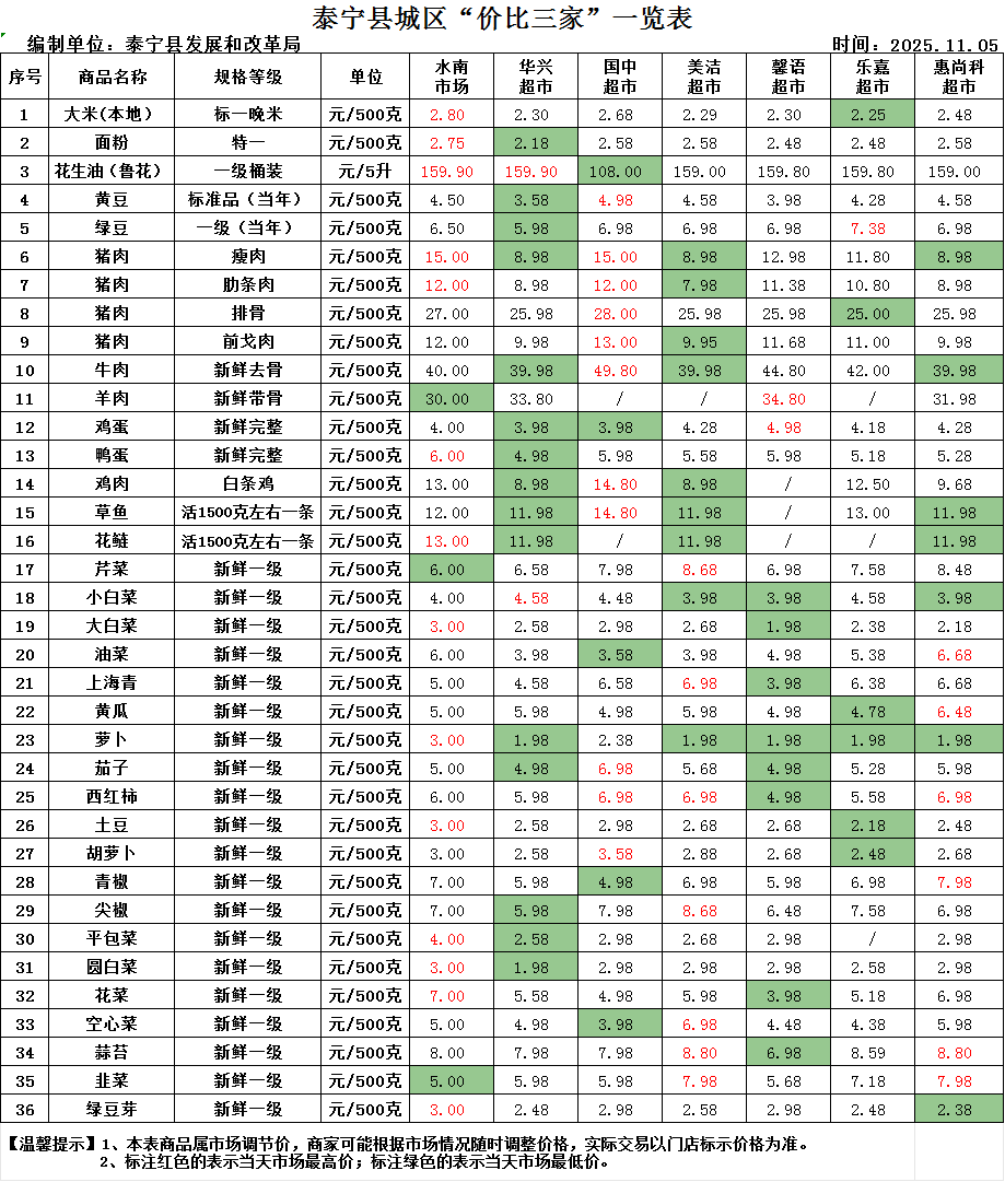 近期,为做好重要民生商品保障需求,保持市场价格稳定,维护正常市场秩序,县发改局从城区水南市场、华兴超市、国中超市、美洁超市、馨语超市、乐嘉超市、惠尚科超市抽取当天36种商品的价格,通过价格对比,让广大市民直观地看到货品价格。