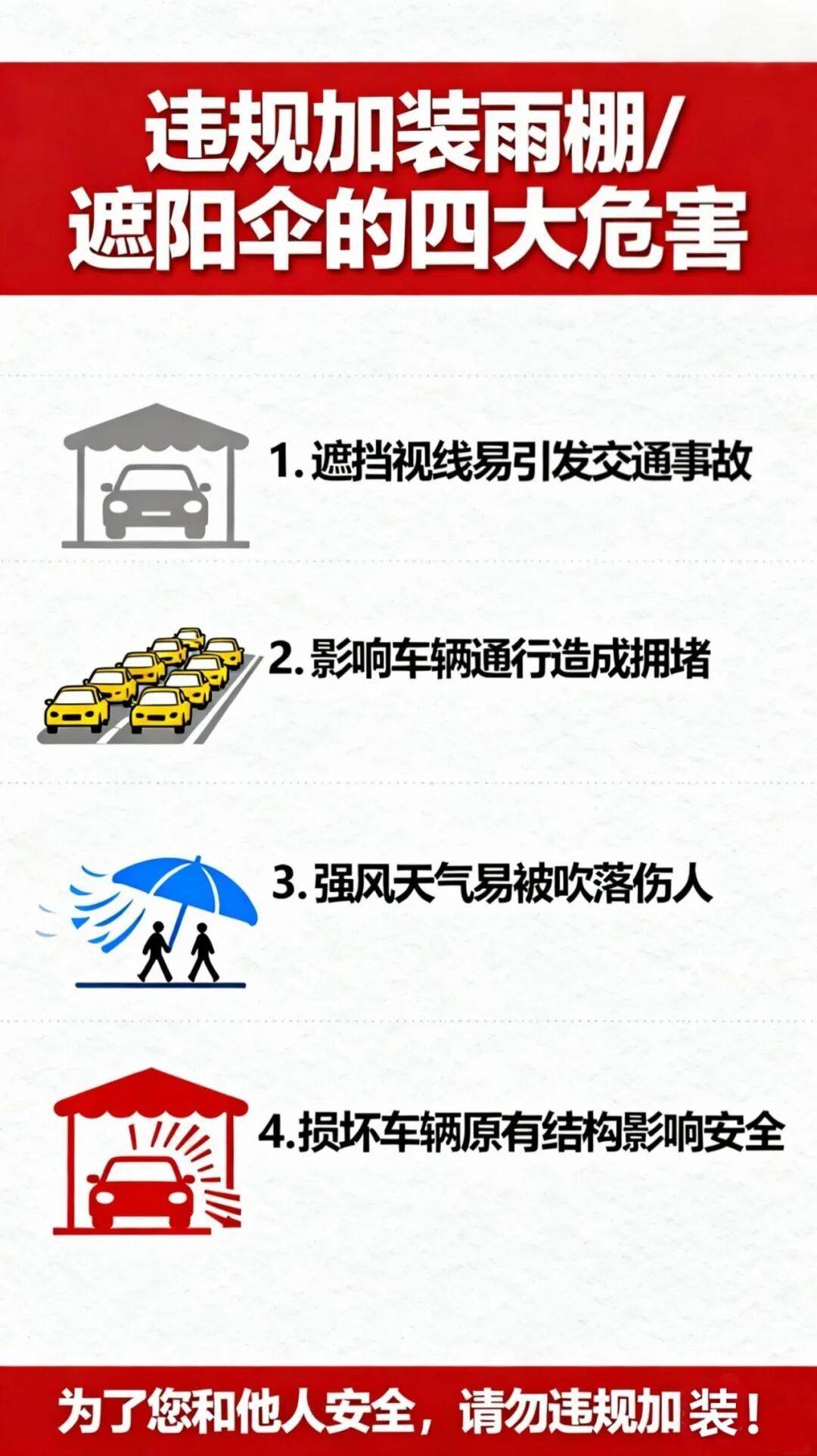 “晴天遮阳,雨天挡雨”,不少电动摩托车、电动自行车车主为图方便给车子加装遮阳伞、雨棚,然而,这看似 “实用”的改装,却藏着极大安全隐患。加装的遮阳伞、雨棚会改变车辆重心,遇风易导致车身摇晃,影响转向灵活性,还可能刮蹭到其他车辆或行人,甚至在事故发生时加重人员伤害,成为道路上的“移动风险源”。