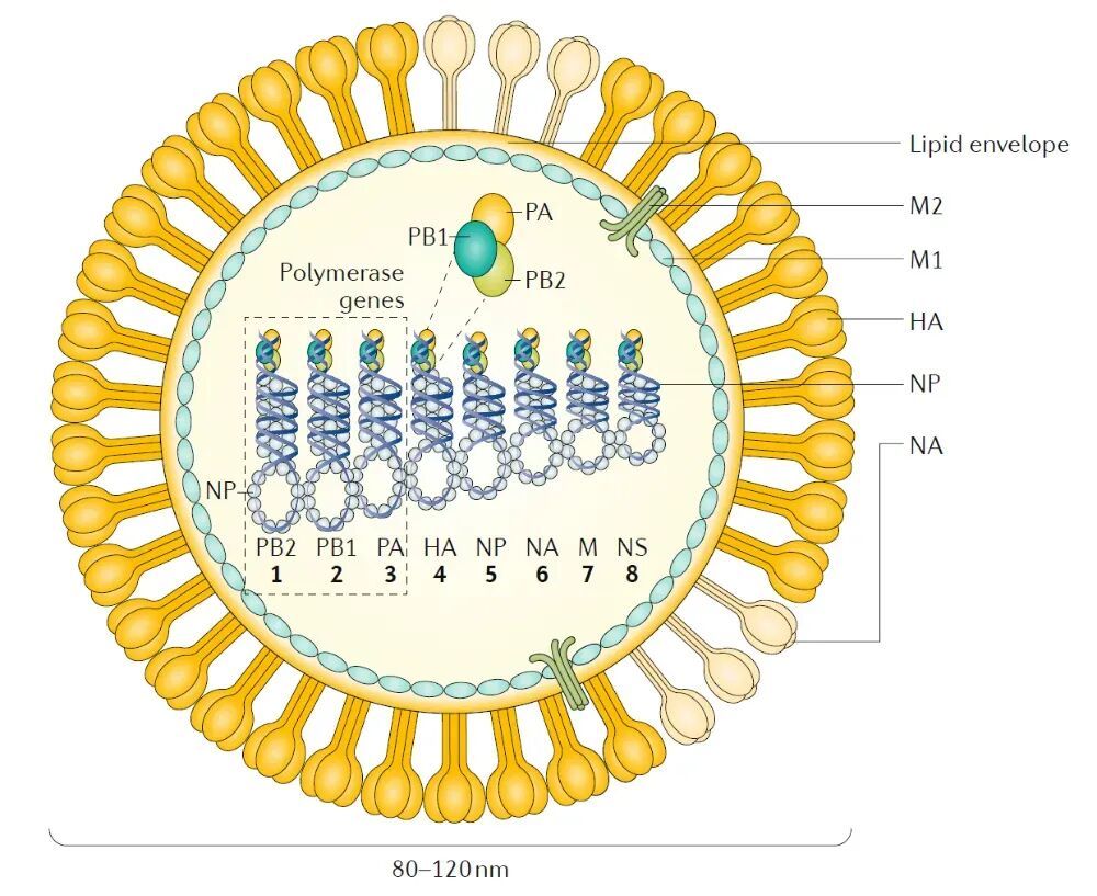 (图源:SOOGIF) “善变”的杀手 流感病毒一般呈球形,直径为80~120nm,内含7个或8个基因节段,可以分为甲(A)、乙(B)、丙(C)、丁(D)四个型别。 甲型流感病毒容易发生变异,曾经多次引起世界性大流行,如1968年的甲型H3N2大流行和2009年的甲型H1N1大流行。 除了大流行,流感病毒还会造成每年的季节性流行,其中甲型H1N1亚型、H3N2亚型及乙型流感病毒中的Victoria系流感病毒常年在人群中交替或叠加流行。在学校、托幼机构和养老院等人群密集的场所容易发生聚集性疫情。