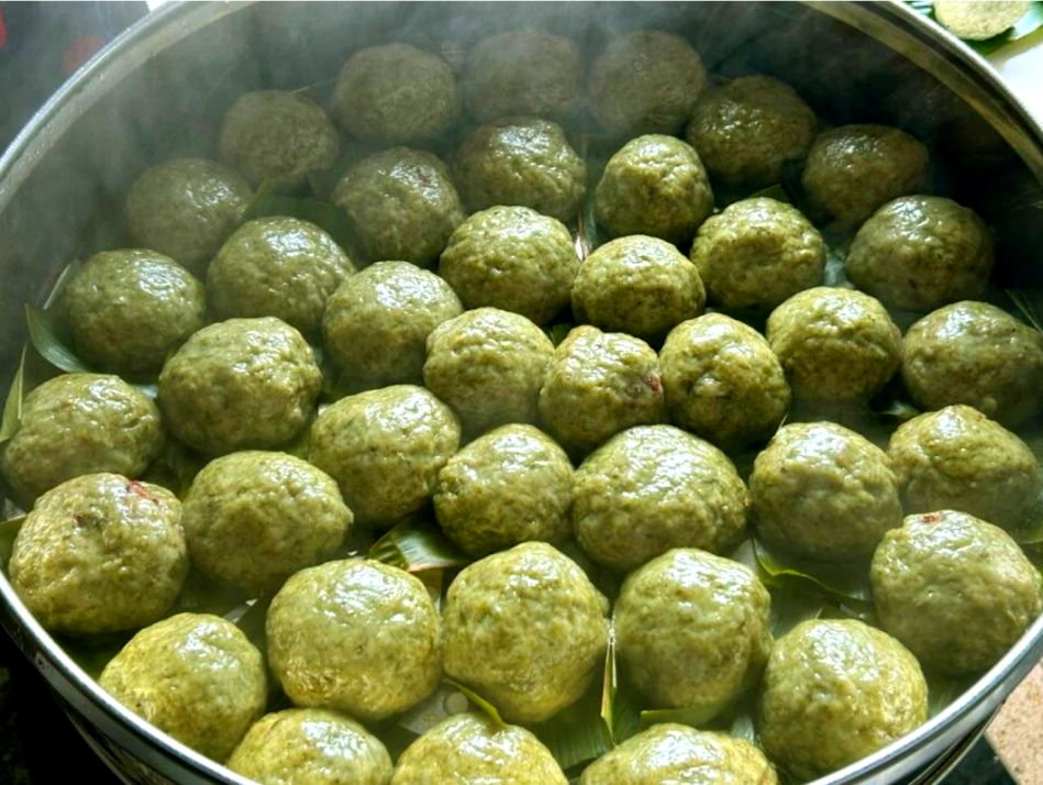 用暖菇磨粉做皮, 包裹着笋干、腊肉制成的 鲜香馅料,蒸锅上汽后, 包子渐渐变得油润松软, 咬下一口, 山野的清香与肉菜的咸鲜在口中交融, 瞬间驱散些许微凉。