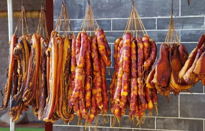 木楼阳台上挂满了腊肉、腊肠、腊鱼, 这些精心腌制的腊味 在微凉空气中泛着油光, 阳光透过薄雪洒在上面, 成了古城最具生活气息的 “冬日晾晒画”。